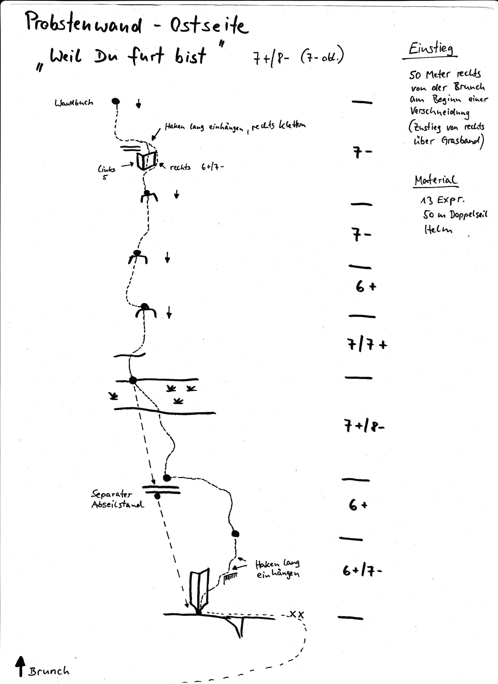 7+/8- (eine Seillänge), meist 7- und 6+ (7- obligat)