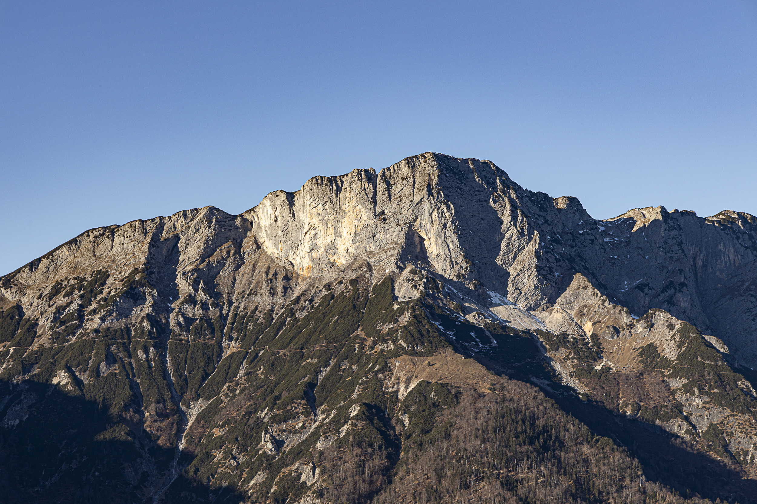 Die Wege von Maria Gern zur Kneifelspitze sind weitgehend frei von Eis und Schnee. Nur stellenweise liegen ein paar Schneeflecken, es sind aber kein Grödeln erforderlich. Die Aussicht vom Gipfel ist hervorragend - vom Hohen Göll über das Steinerne Meer und natürlich dem Watzmann bis hin zum Hochkalter und der Reiteralm hat man das komplette Berchtesgadener Panorama im Süden vor der Linse. Nach Norden hin baut sich dann der Untersberg auf und rechts davon reicht der Blick hinaus in den Talkessel von Salzburg. Die Schneelage in den Berchtesgadener Alpen lässt derzeit noch keine Skitouren zu, selbst in den höheren Lagen hat es kaum mehr als 20-30 cm in den Schattenhängen, die Sonnenhänge sind komplett schneefrei.