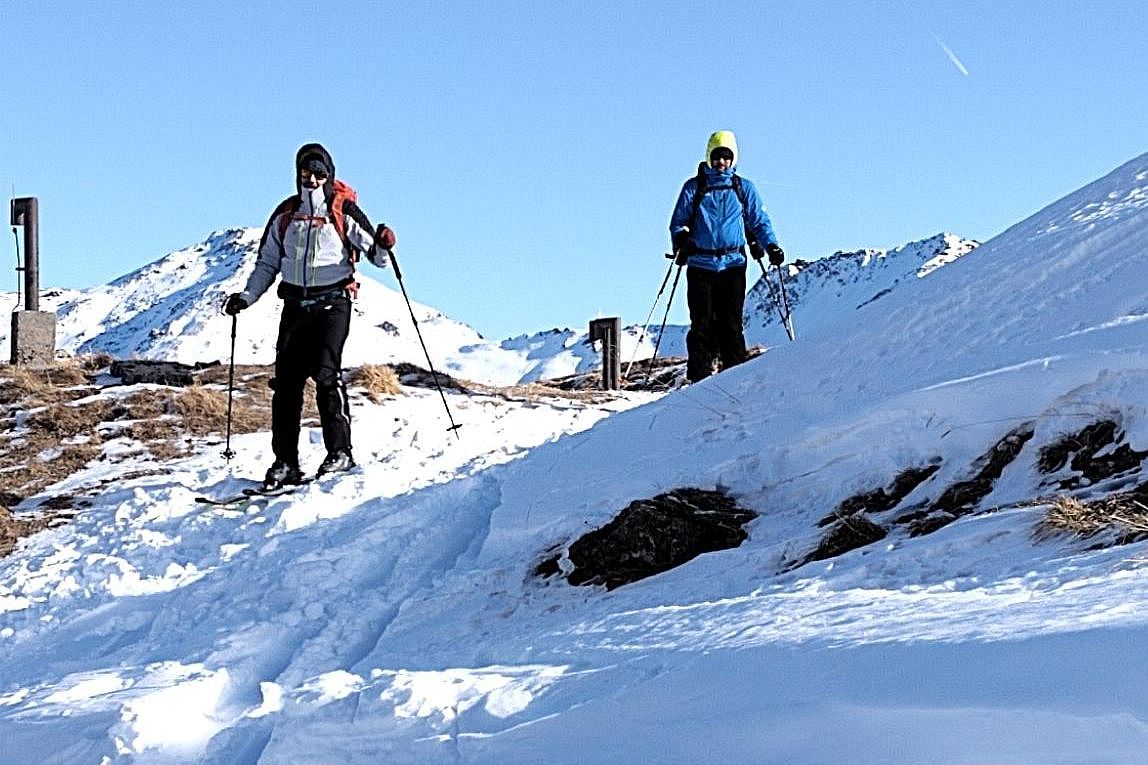 Zuerst die gute Nachricht, man kann vom Parkplatz gut mit Ski zur Hütte hochgehen. Im Tourengebiet dann wenig Schnee, sehr verblassen. Schneequalität mäßig und oft windgepresst. Man kann zu einigen diversen Gipfeln aufsteigen und hat überall Schnee zum gehen, aber bei der Abfahrt muss man sehr genau schauen. Die Schneestabilität ist auch sehr schlecht: Triebschnee und ausgeprägte Schwachschicht vorhanden. Für Ausbildung OK, tolle Skitouren sind was anderes.