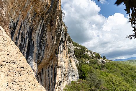 Ab Ostersamstag bessert sich das Wetter dann nachhaltig und wir rechnen mit größerem Andrang an den Felsen. Daher wollen wir den etwas abgelegenen Sektor Colleolivio erkunden, der 300 Höhenmeter oberhalb Ferrentillo liegt. Auf schmaler Bergstraße geht’s zum kleinen Parkplatz in dem Bergdörfchen. „Are you looking for the crag?“ fragt uns eine freundliche Italienerin, kaum dass ich die Autotür geöffnet habe. Sie erzählt, dass sie vor ein paar Tagen dort war und dass der Zustieg nicht so einfach zu finden sei. Mit den Insidertipps im Gepäck kommen wir problemlos bis 50 m vor die Wand, die letzte Abzweigung verpassen wir aber trotzdem und müssen uns doch noch kurz durch die Büsche hangeln. Die Wand entspricht nicht ganz unseren Erwartungen. Anhand des Topos hatten wir mit einer größeren Anzahl leichter Routen im Bereich 5c bis 6a gerechnet, die es zwar gibt, aber die teilweise zugewachsen sind, von einem luftigen Band starten oder einen sehr schrägen Routenverlauf über steilem Gelände haben, so dass sie als leichte Nachsteigerroute nicht optimal sind. Nachdem wir aber die einzigen Kletterer am Fels sind, reichen uns die vorhandenen Linien aus, um alle gut zu beschäftigen. Die Kinder und Frauen grasen die leichteren Routen ab, Stefan bastelt sich eine lange, eindrucksvoll steile 7b+ hinauf, und ich hake ab, was in meinem Onsight-Level so machbar ist. Unser Fazit: Wegen der leichteren Routen muss man sich den 20-minütigen Zustieg nicht antun, aber die steilen Linien im 7. Franzosengrad sind super.