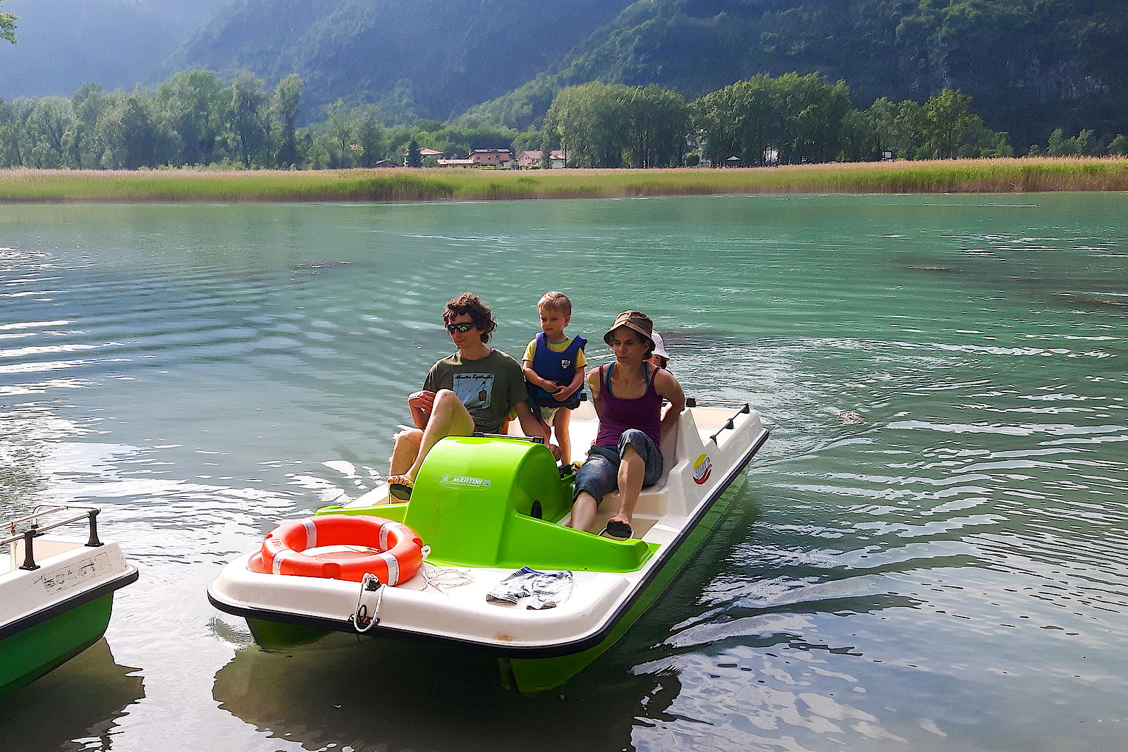 Mittwoch ist Männerklettertag. Unsere Familien hängen heute am Zeltplatz und am See ab, für den späteren Nachmittag verabreden wir uns zum Bootfahren. Davor haben wir frei. "Die schönsten Sportkletterrouten in Friaul gibts bei Villa Santina!" Diese Aussage eines Locals, den wir letzten Herbst in Anduins getroffen haben, wollen wir heute überprüfen. Wir entscheiden uns für den Sektor Madrabau. Immerhin 10 Minuten Zustieg lassen ahnen, dass die Wand lohnend sein muss. Und tatsächlich: Der Fels schaut super aus. 30 Meter hoch, durchweg senkrecht bis leicht überhängend, nicht zu wenig aber auch nicht zu viel Struktur, teils leicht versintert. Bis die Sonne gegen Mittag die süd-südwestseitige Wand zu sehr aufgeheizt hat sind wir je vier Routen geklettert, die alle gut bis sehr gut sind. Um halb zwei stehen wir wieder am Parkplatz, um vier sollen wir am See sein. "Die zwei Stunden können wir noch in Somplago abhängen" schlage ich vor. Das Gebiet liegt direkt am Rückweg, der Zustieg ist mit 50 Metern auch kein Zeitfaktor. Nach weiteren je zwei Routen an den scharfen Löchern sind unsere Finger durch und wir können gemütlich Tretbootfahren.