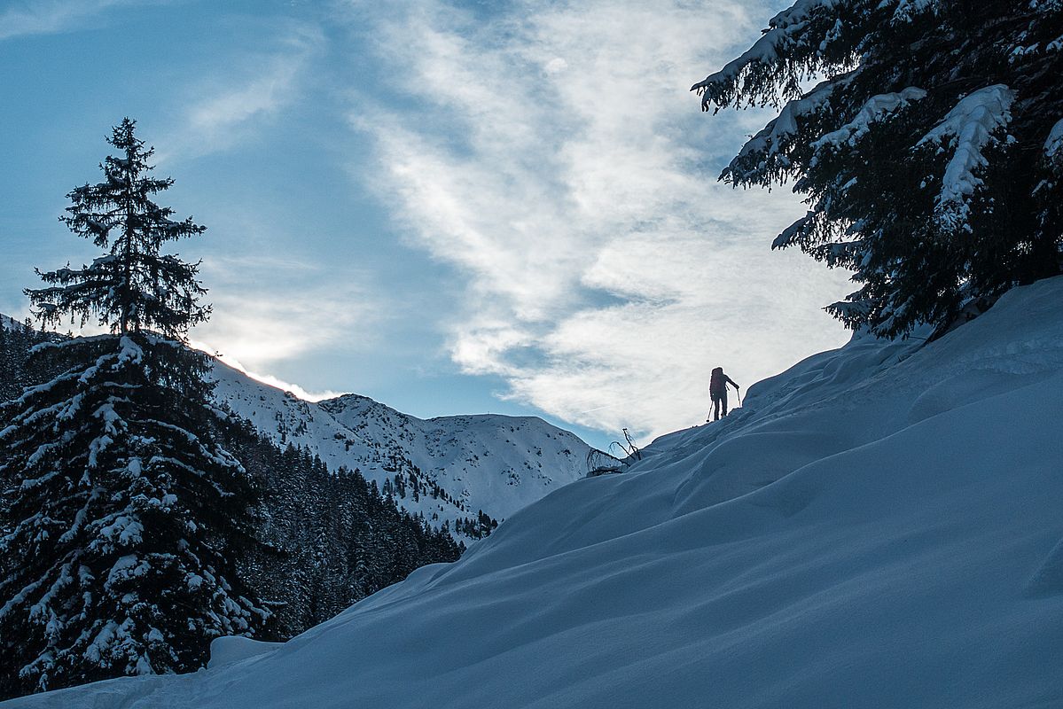 Während der Wind langsam aber sicher zulegt, machen wir uns an die Abfahrt, stopseln durch Triebschnee und über abgeblasene, bruchharschige Flächen zurück in den lichten Wald, wo noch feiner Pulverschnee liegt. Der letzte Hang an der Mareitalm hingegen hat inzwischen schon etwas Wind bekommen und ist nicht mehr so gut zu fahren. Hinter einigen Hangkanten gab es auch schon kleine spontane Schneebretter. Das dürfte sich in kurzer Zeit noch deutlich verschärfen - während ich jetzt zwei Stunden danach den Bericht schreibe, sind die Spitzenboen am Kleinen Beil bereits bei 119 km/h - und morgen soll der Sturm erst so richtig wüten.