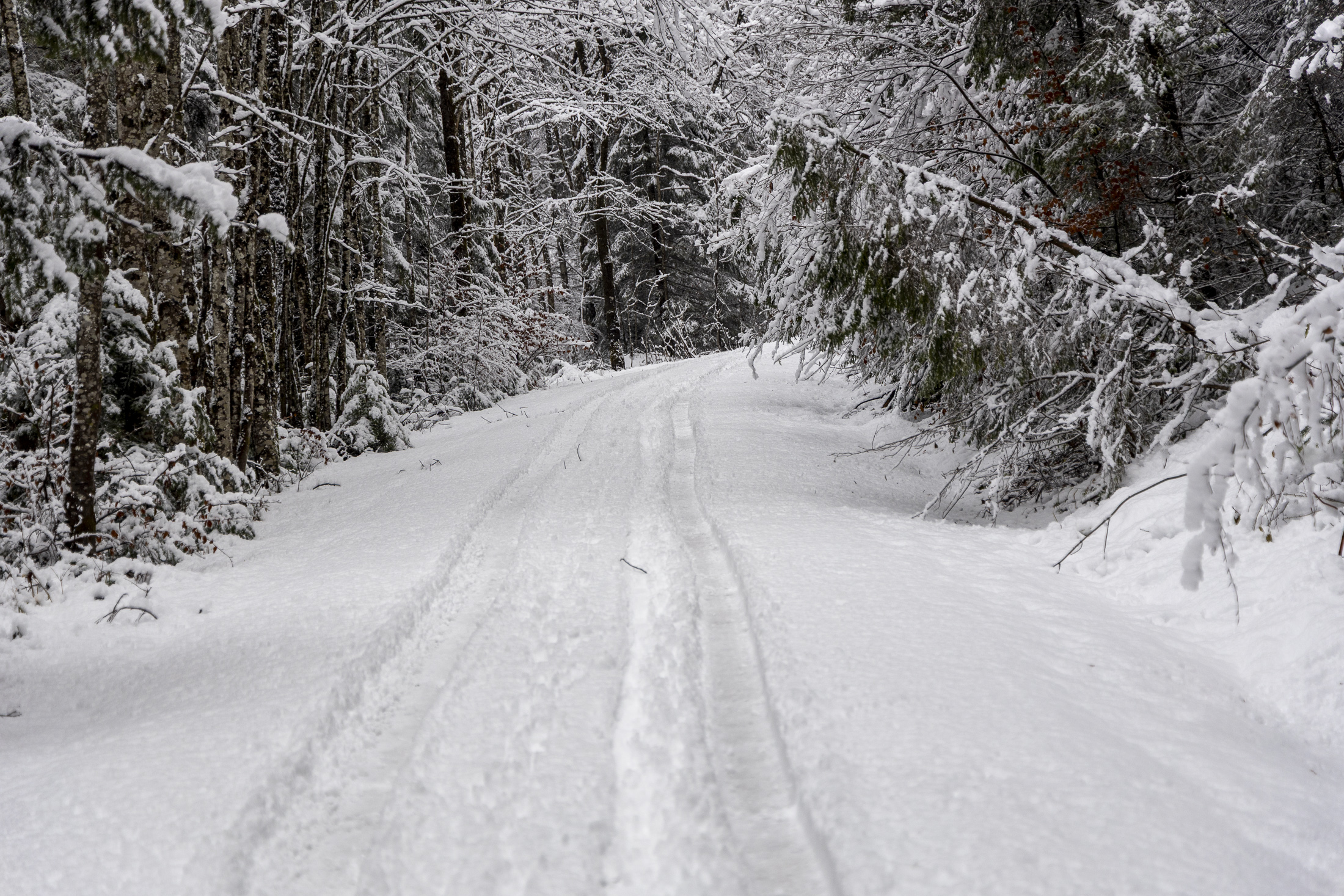 In Sachrang auf gut 700 m ü. NN liegen etwa 15 cm Nassschnee. Die Forststraße zur Priener Hütte kann problemlos mit Ski begangen und auch wieder darüber abgefahren werden. Die Straße ist allerdings nicht zum Rodeln präpariert, dafür gibt's eine tiefe Traktorspur. Der Sommerweg von Huben bis zur Diensthütte hat noch zu wenig Schnee. An der Diensthütte (ca. 900 m) liegen dann bereits 25 cm pappiger Schnee und bis zur Thalalm (1100 m) werden es etwa 35 cm sein. Bis hierher war es äußerst klebriger Betonschnee, der überall angestollt ist, wo man sich nur vorstellen kann: auf dem Fell, unter dem Fell, auf dem Ski und an den Schuhen.