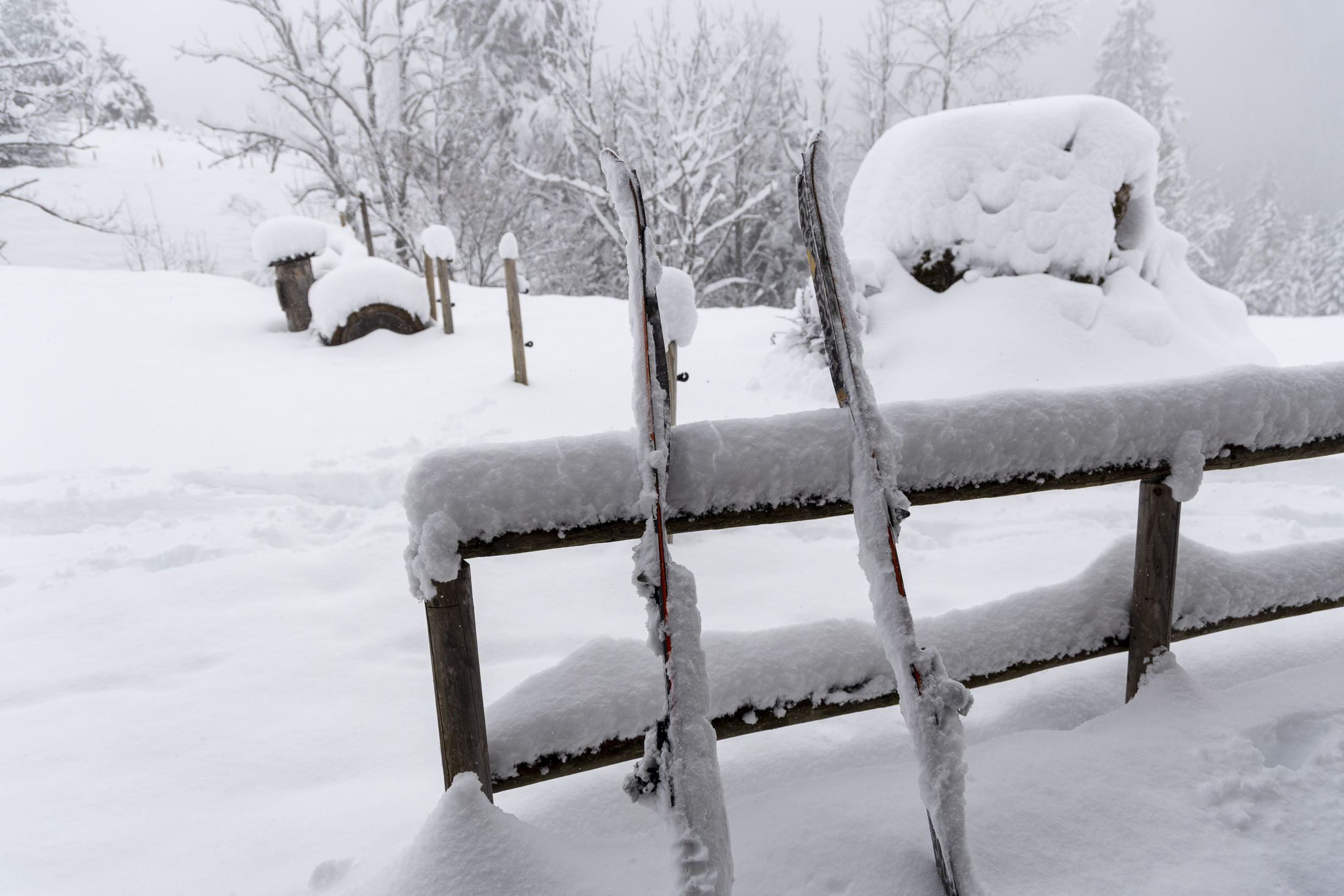 Für die Abfahrt hatte es dann fast zu viel Schnee. In der Geigelstein-Westmulde wird es etwa ein halber Meter gewesen sein, der oberflächlich auch schön pulvrig war. Man sank zwar tief ein, kam aber nicht mehr auf den Grund durch. Aufgrund der schlechten Sicht bin ich dann über die Aufstiegsspur wieder zur Straße abgefahren und auf dieser zurück ins Tal. Die Wiesen an der Thalalm konnte man ohne Grundberührung befahren, auch wenn der Schnee hier schon recht schwer war. Das Flachstück nach der Diensthütte lief aufgrund des bremsenden Schnees sehr schlecht.