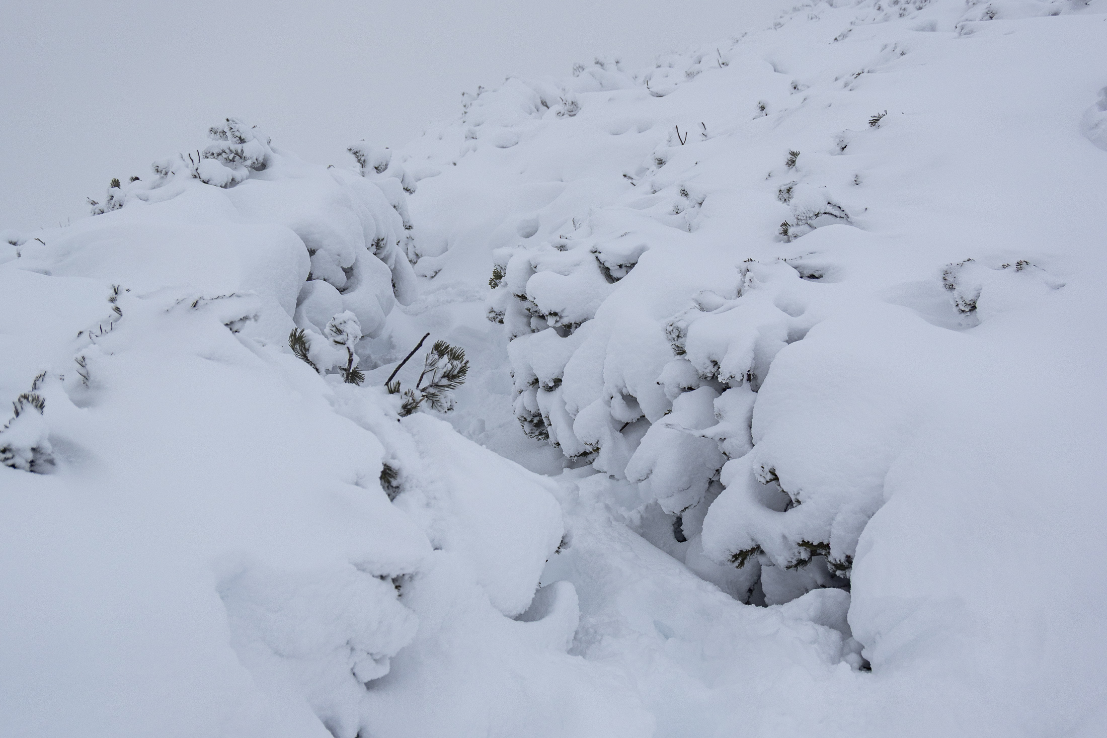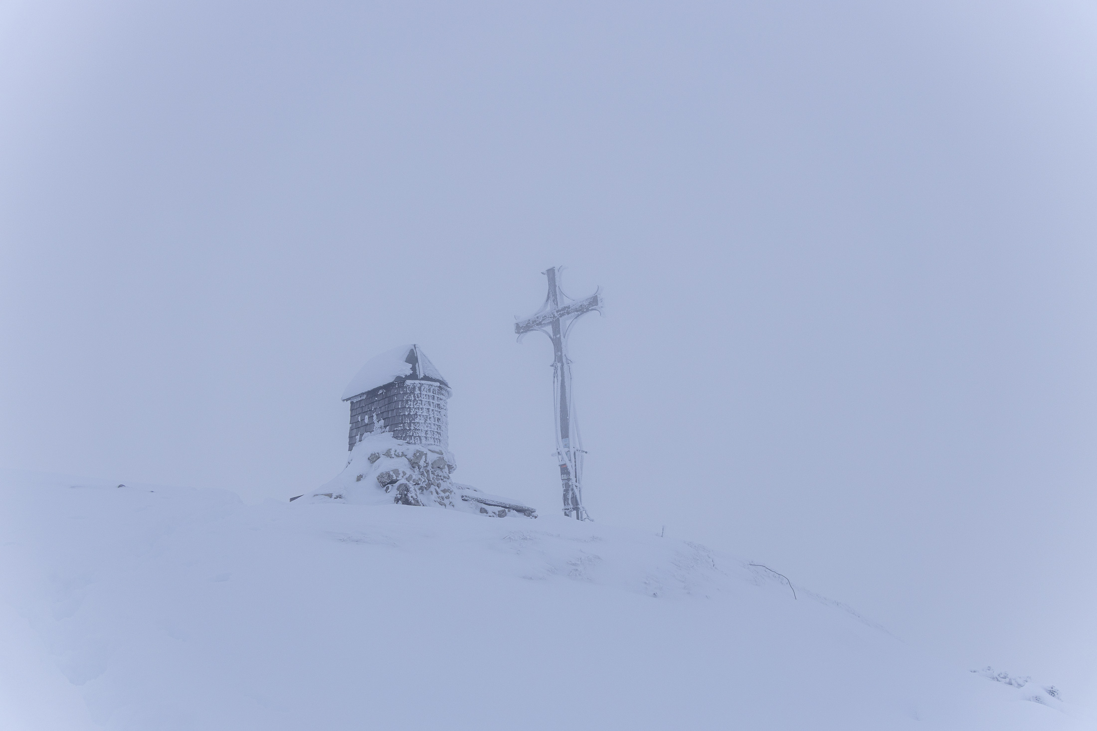 Aber ab der Alm wurde der Schnee dann deutlich pulvriger und stollte nur noch wenig. Dafür war das 20 Jahre alte Steigfell meiner Steinski komplett durchnässt und irgendwann mit seiner Klebelust am Ende. Es wollte partout nicht mehr kleben und blieb nur noch durch die Fixierung vorne und hinten so halbwegs am Ski, allerdings nur so lange, wie die Spur flach genug war. Es gab zwar schon eine Aufstiegsspur, allerdings war die zu steil für mein nicht mehr klebendes Fell. Daher hab ich mich ab der Oberkaseralm auf einer eigenen Spur durch den tiefen Neuschnee zum Geigelsteinsattel hinaufgequält. Dort deponierte ich die Ski und stapfte zu Fuß weiter. Im Gipfelhang sind die Latschen noch komplett offen und Ski machen hier keinen Sinn. Der Sommerweg ist aber noch gut sichtbar und im knie- bis oberschenkeltiefen Pulver ging es das letzte Stück zum höchsten Punkt.