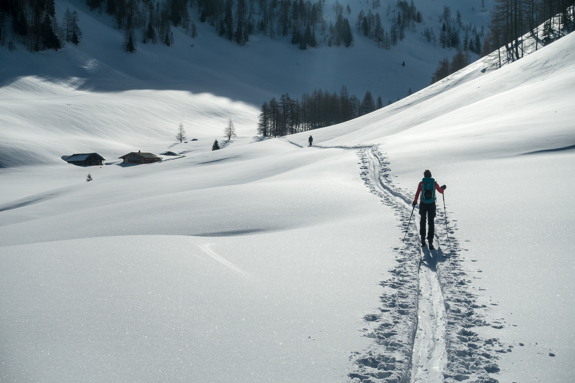 Lawinenwarnstufe 1, perfektes Winterwetter und Schneemengen, wie es sie nur selten gibt: da kann man schon mal die etwas aus der Reihe tanzenden Skitouren angehen. Also sind wir kurz nach 8 am Parkplatz im Spertental, wo etwa 1 Meter gut gesetzter Altschnee liegt und sich ganze Heerscharen an Tourengehern zu den Modebergen auf der rechten Talseite aufmachen.