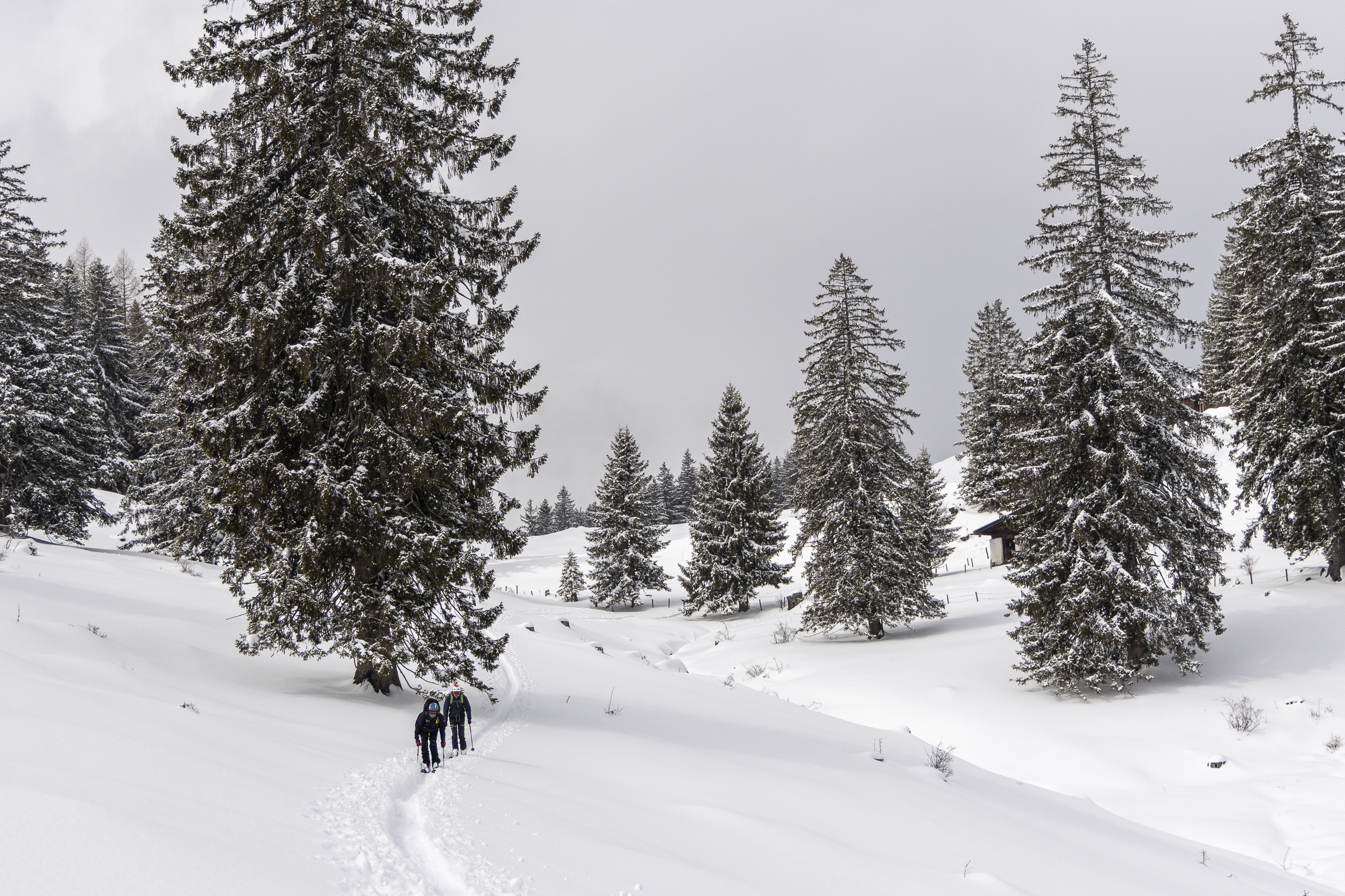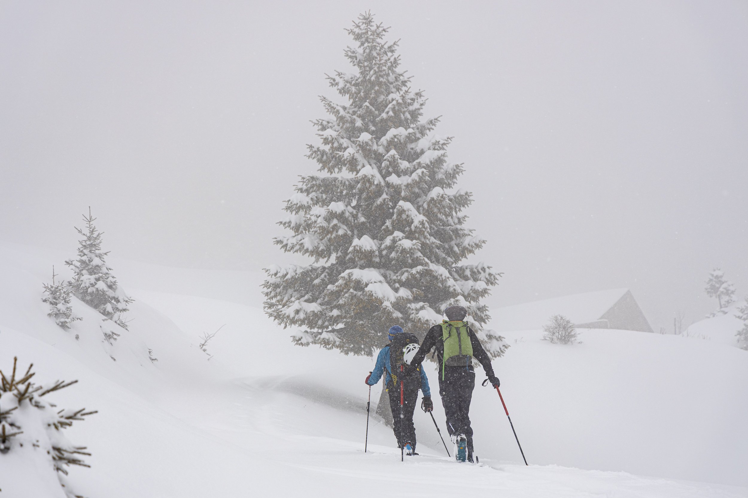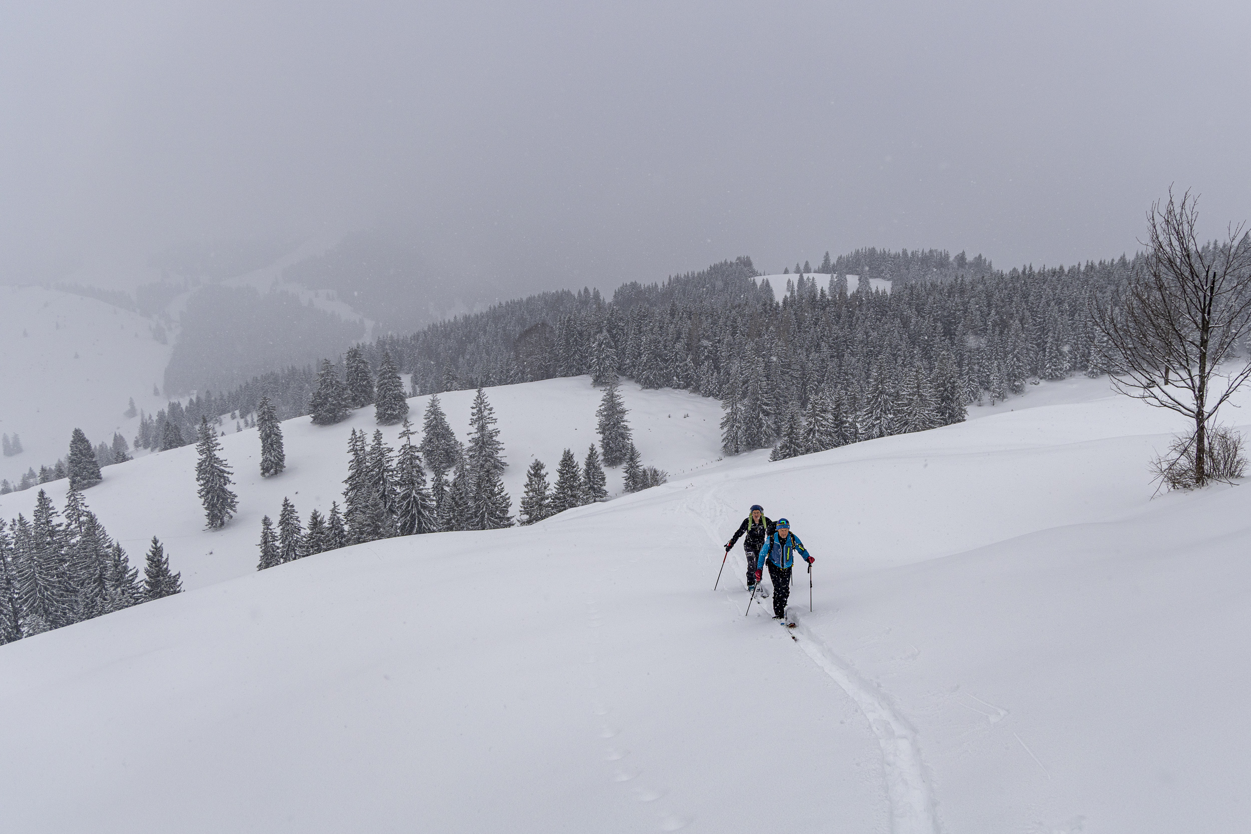 Am Ausgangspunkt an der Sudelfeldstraße lagen 15 cm Neuschnee von heute Nacht auf gut gesetzter Unterlage von etwa 30-40 cm. Nach oben hin wurde die Unterlage etwas mehr, in steileren Südhängen aber auch weniger, so dass man um die verdächtigen Hügel tunlichst außen herumfuhr. Der Harry hat diese Regel einmal missachtet und daraufhin einen Ski ausgezogen und einen sehenswerten Salto hingelegt.