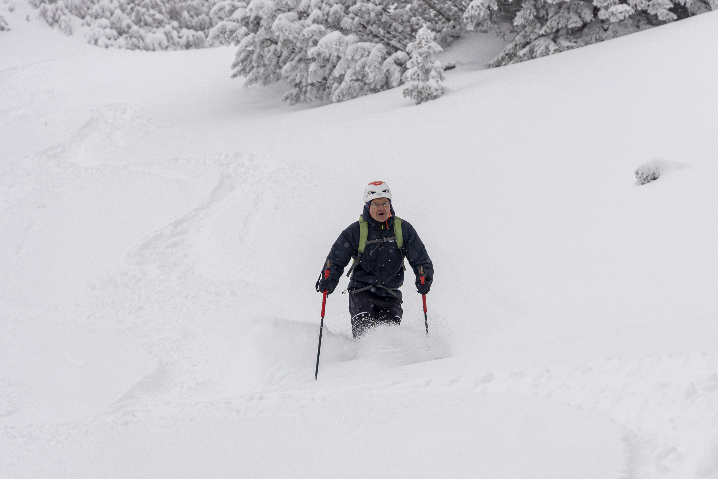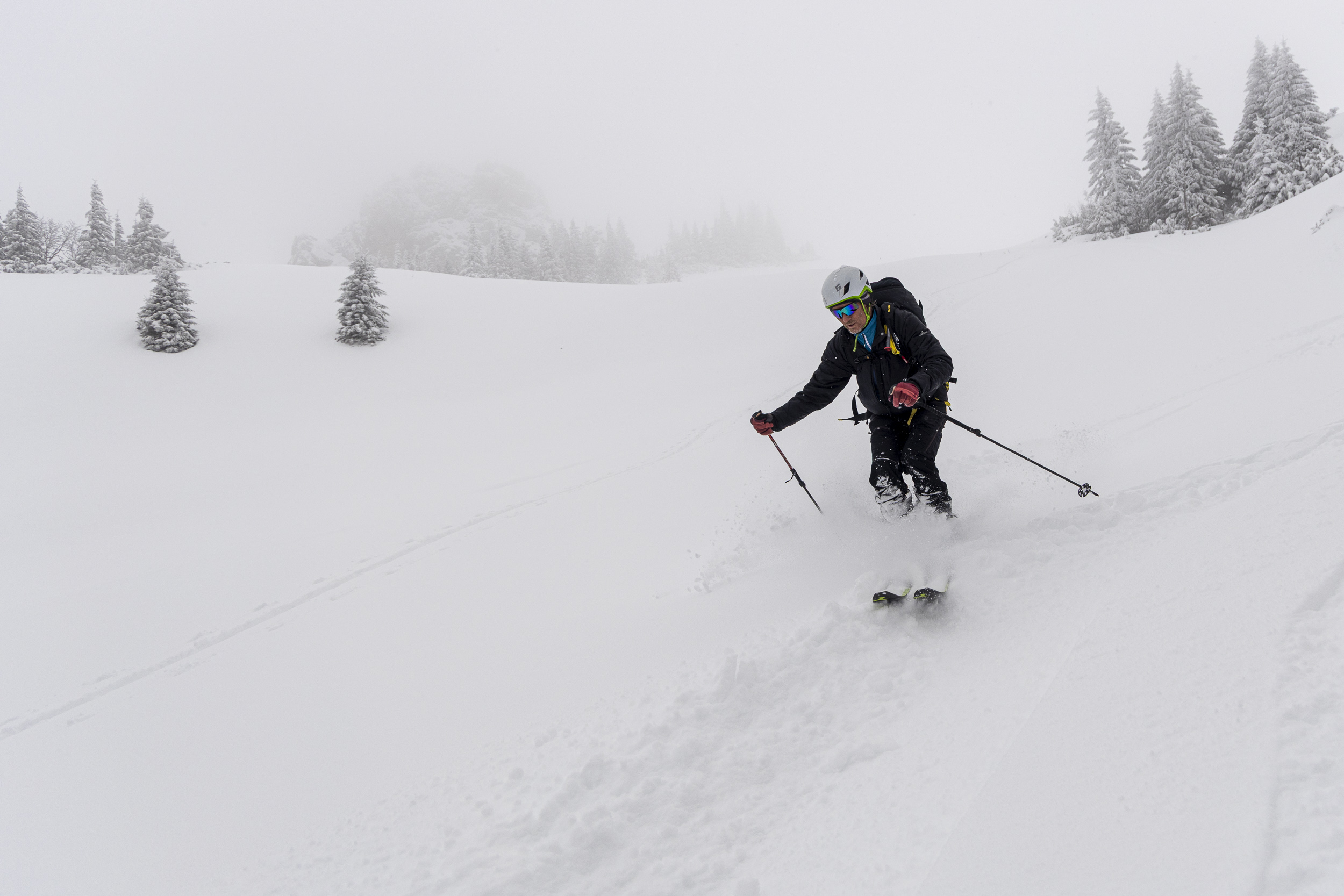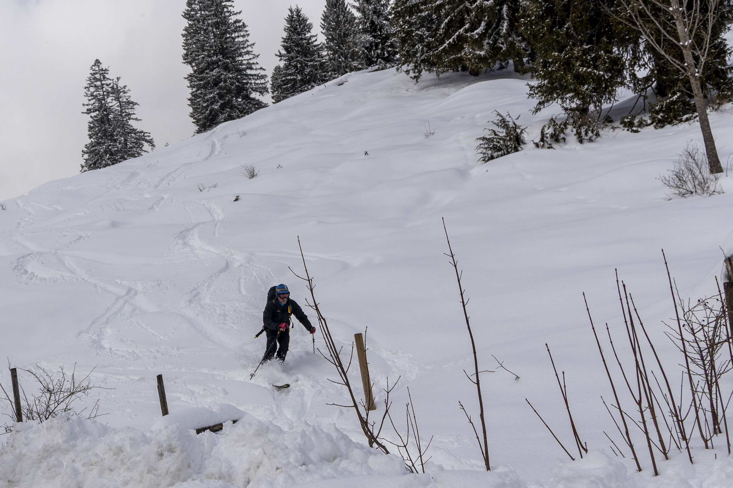 Dafür gab es bei den Abfahrten Seehangscharte-Süd und vom Gipfel nach Westen unterm Lacherlift bis zu den Wendelsteiner Almen besten Pulverschnee. Ebenso bei der Talabfahrt zurück ins Sudelfeld im Lacherkar. Um die Mittagszeit wurde der Schnee dann ab Ausgang Lacherkar durch die Strahlung während weniger kurzer Wolkenlücken aber schnell pappig.