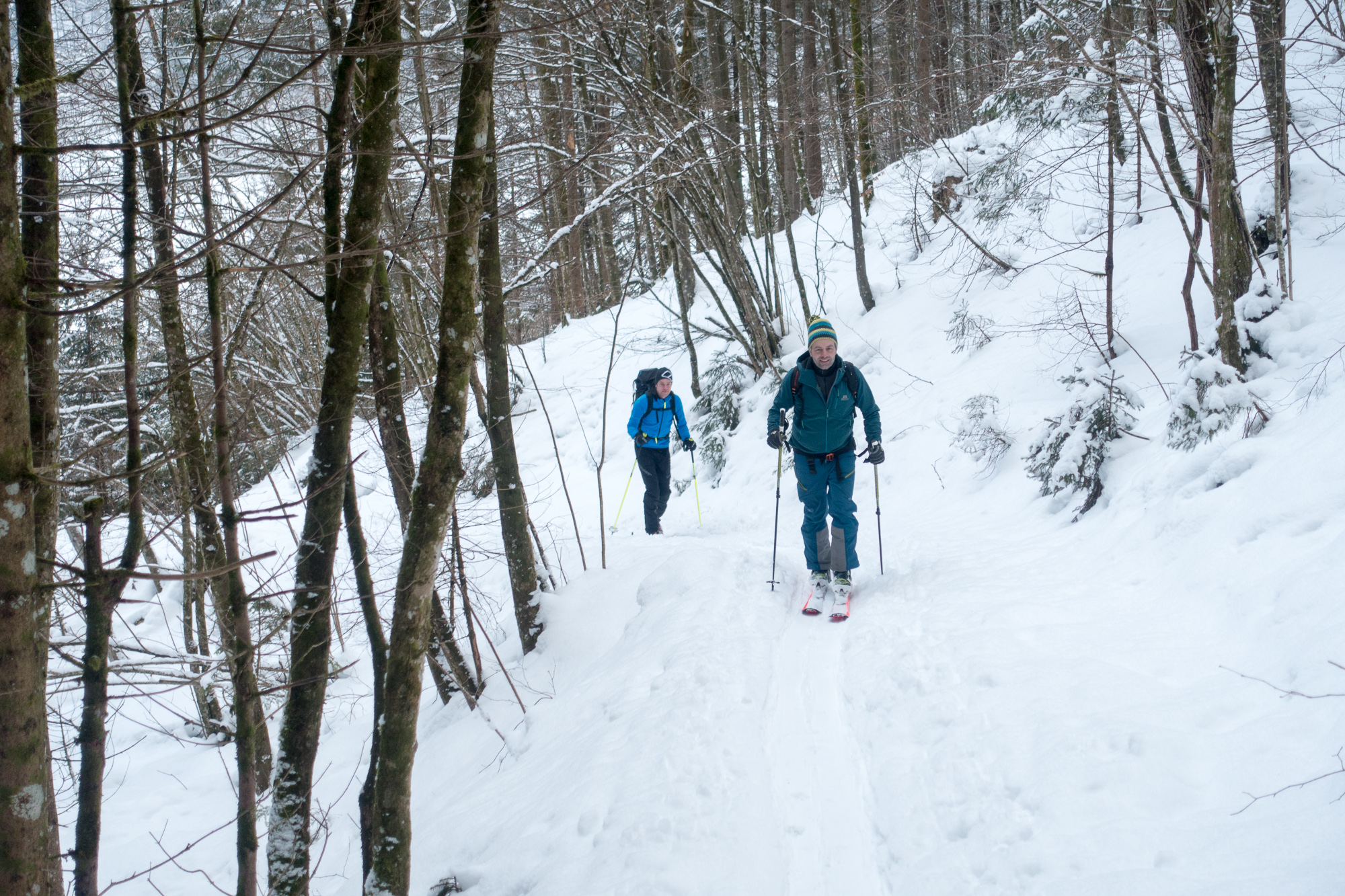 Die Abfahrt: Oberhalb der Waldgrenze hatte der Schnee schon deutliche Qualitätseinbußen durch den Wind, aber unterhalb ca. 2000 m erwarteten uns tip-top Bedingungen. Ab etwa 1500 m war die Unterlage nicht mehr ganz tragfähig. Ab etwa 1400 m ging es auf dem wie eine Bobbahn ausgefahrenen Sommerweg zurück zur Forststraße und auf dieser die letzten 200 Hm zum Auto.