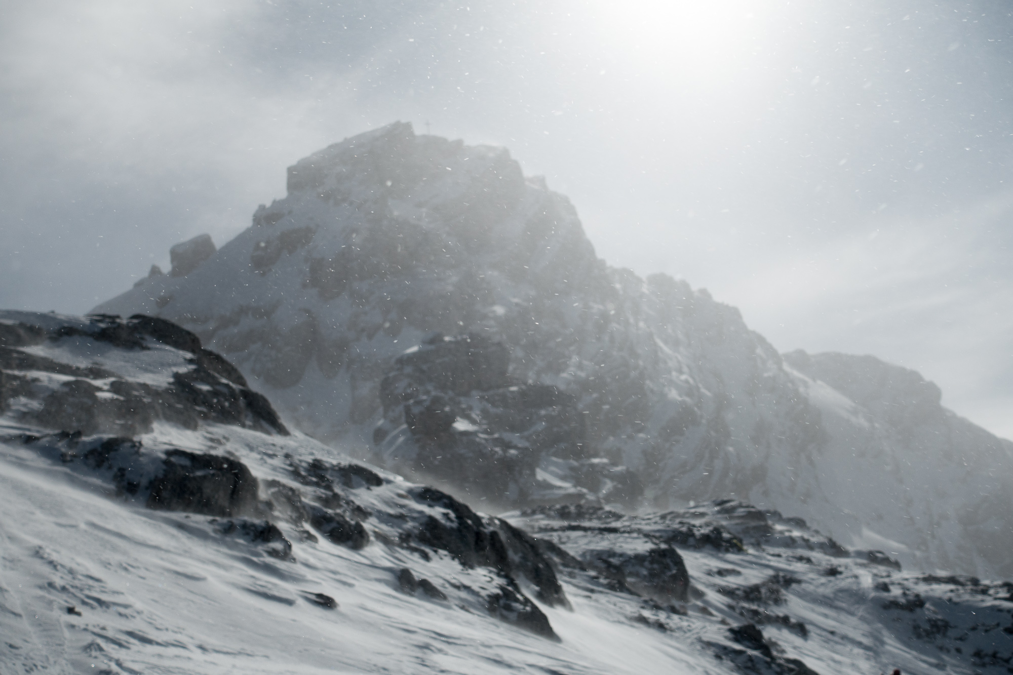 Oberhalb der Waldgrenze fing dann leider der Wind zu blasen an - bei allerdings immer noch wolkenlosem Himmel. Erst am letzten Hang unter dem Kuchelnieder begann von Westen der Wolkenschirm aufzuziehen. Als wir gegen Mittag an der Scharte (Skidepot) ankamen ging es dann aber relativ schnell: die Sonne verschwand, der Wind legte noch etwas zu und die ersten Flocken fielen. Wir verzichteten daher diesmal auf den Fußaufstieg zum Gipfel und fuhren wieder ab.