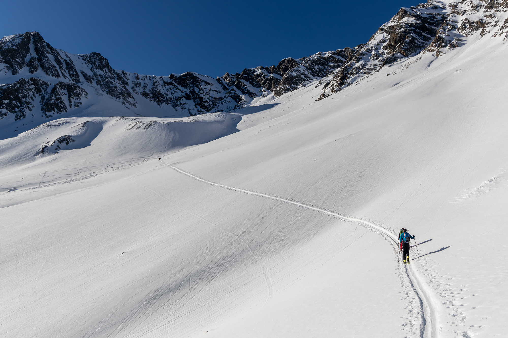 Die Abfahrt ging insgesamt ziemlich gut. Die windgepressten Flächen im oberen Teil und das gesamte Längental im Bereich der Abfahrtsspuren waren fast pistenähnlich zu fahren, Steine sind hier eigentlich kein Thema. In dem steileren Abschnitt dazwischen gab es Pulverschnee, wobei es einen guten Blick für die richtigen Mulden benötigt, um weder steiniges Gelände, noch gedeckelten Schnee zu erwischen. Beim Blick auf die umliegenden Berge ist es aber kaum zu glauben, dass man hier doch noch so eine schöne Abfahrt findet.