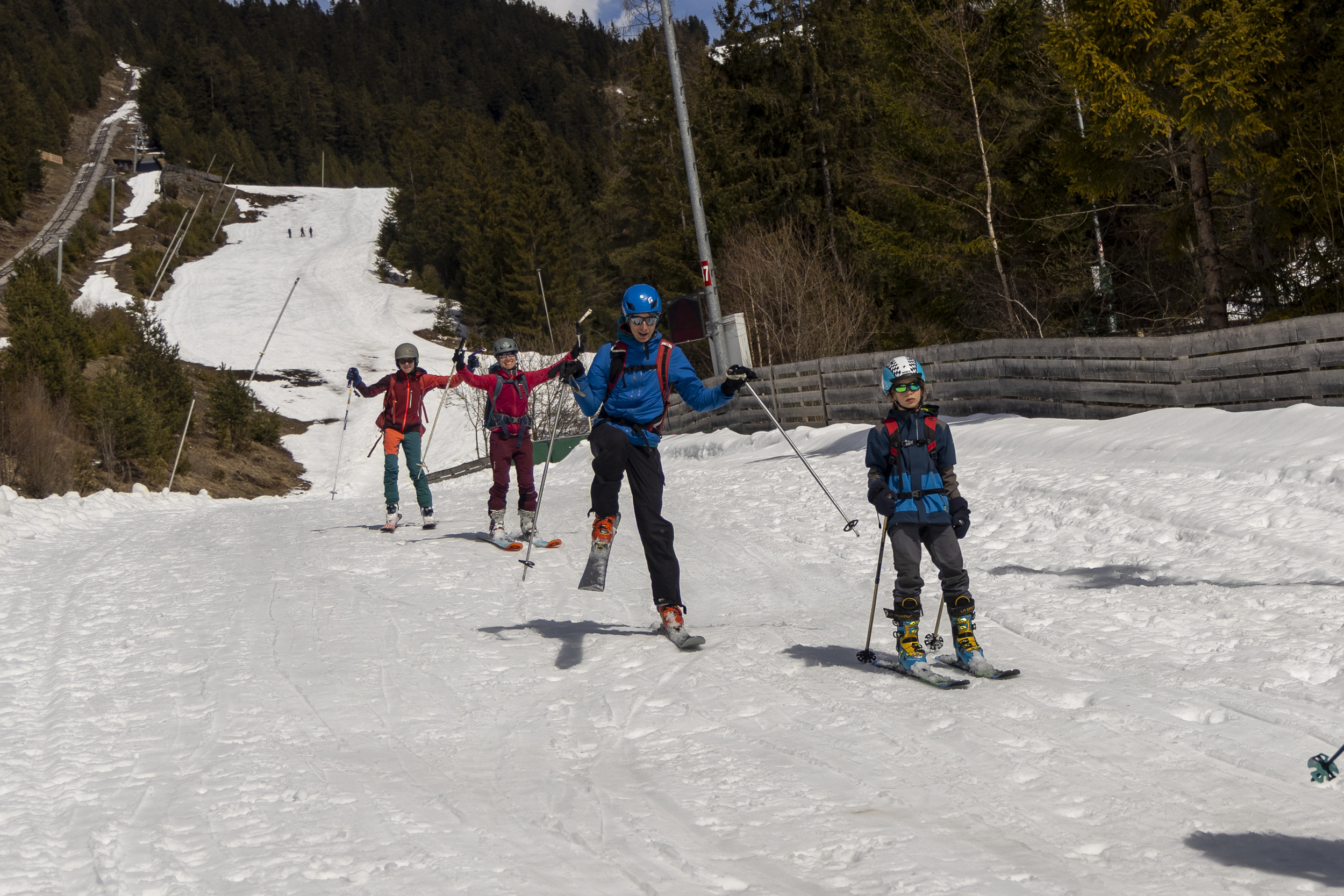 Familienpistenskitour im geschlossenen Skigebiet mit alpinem Finale.