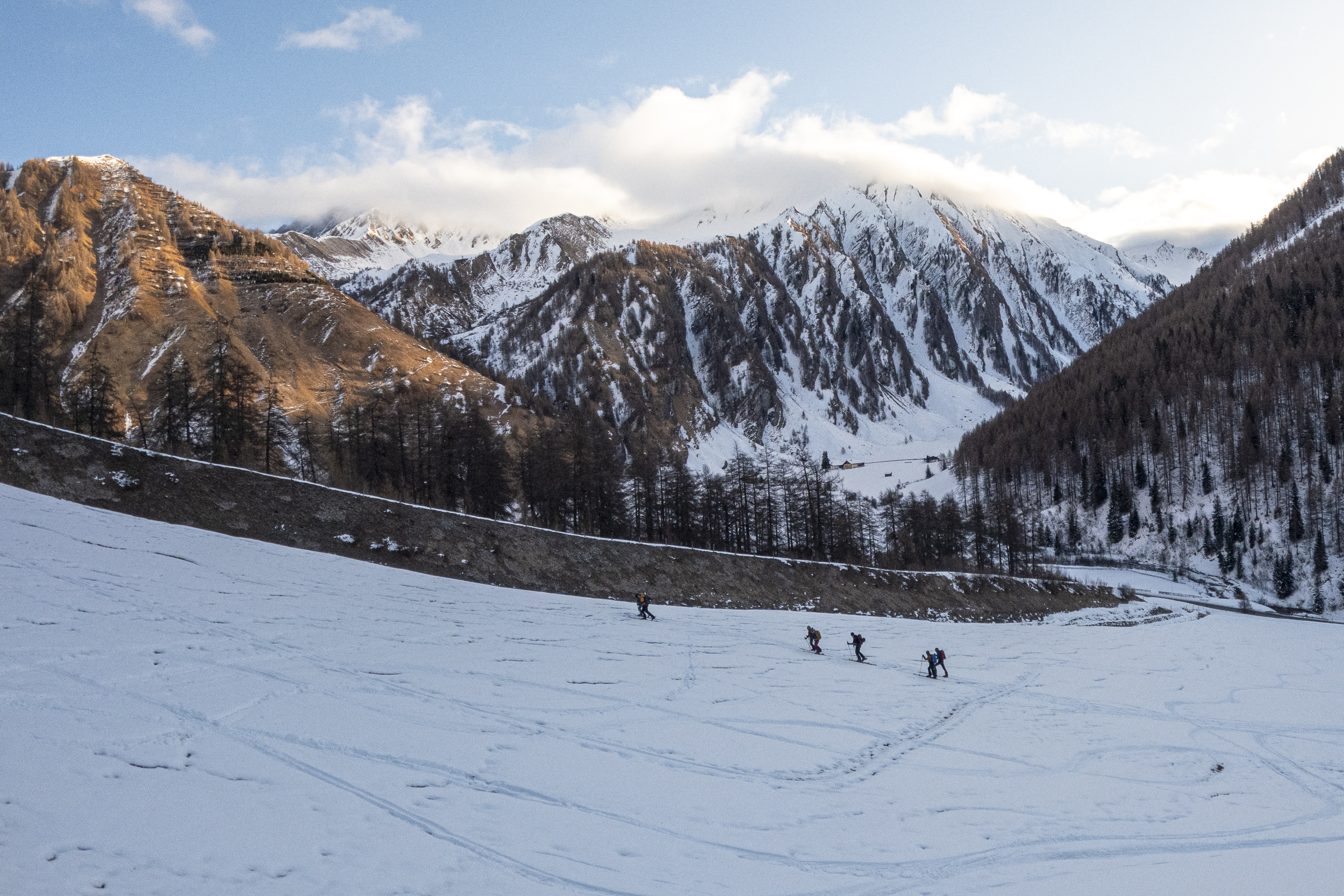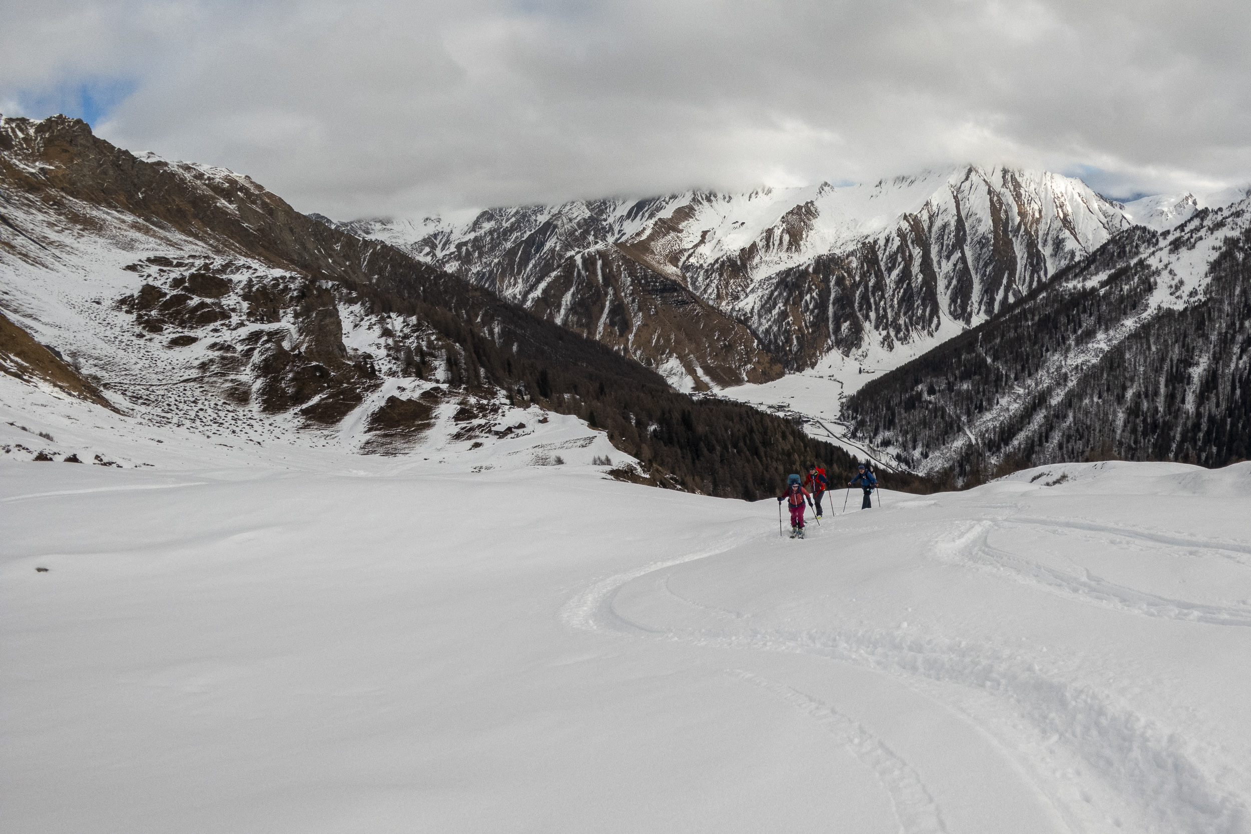 Tour E12: Erstes Stück bis zum Bach muss man tragen, danach sollte alles mit Ski machbar sei. Steilere Südseiten vermutlich aber mit Harschdeckel in den flacheren Mulden könnte es netten Pulver haben.