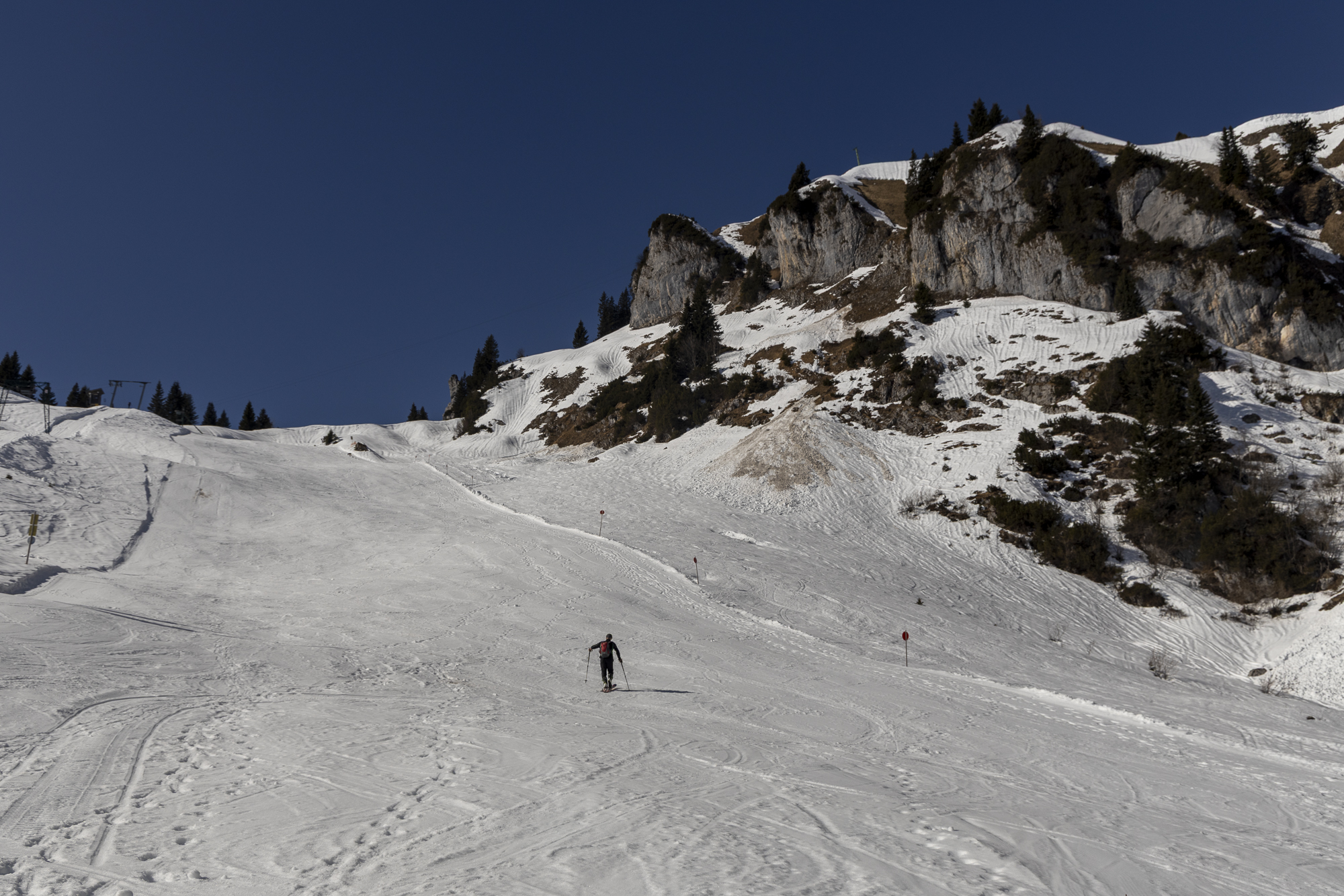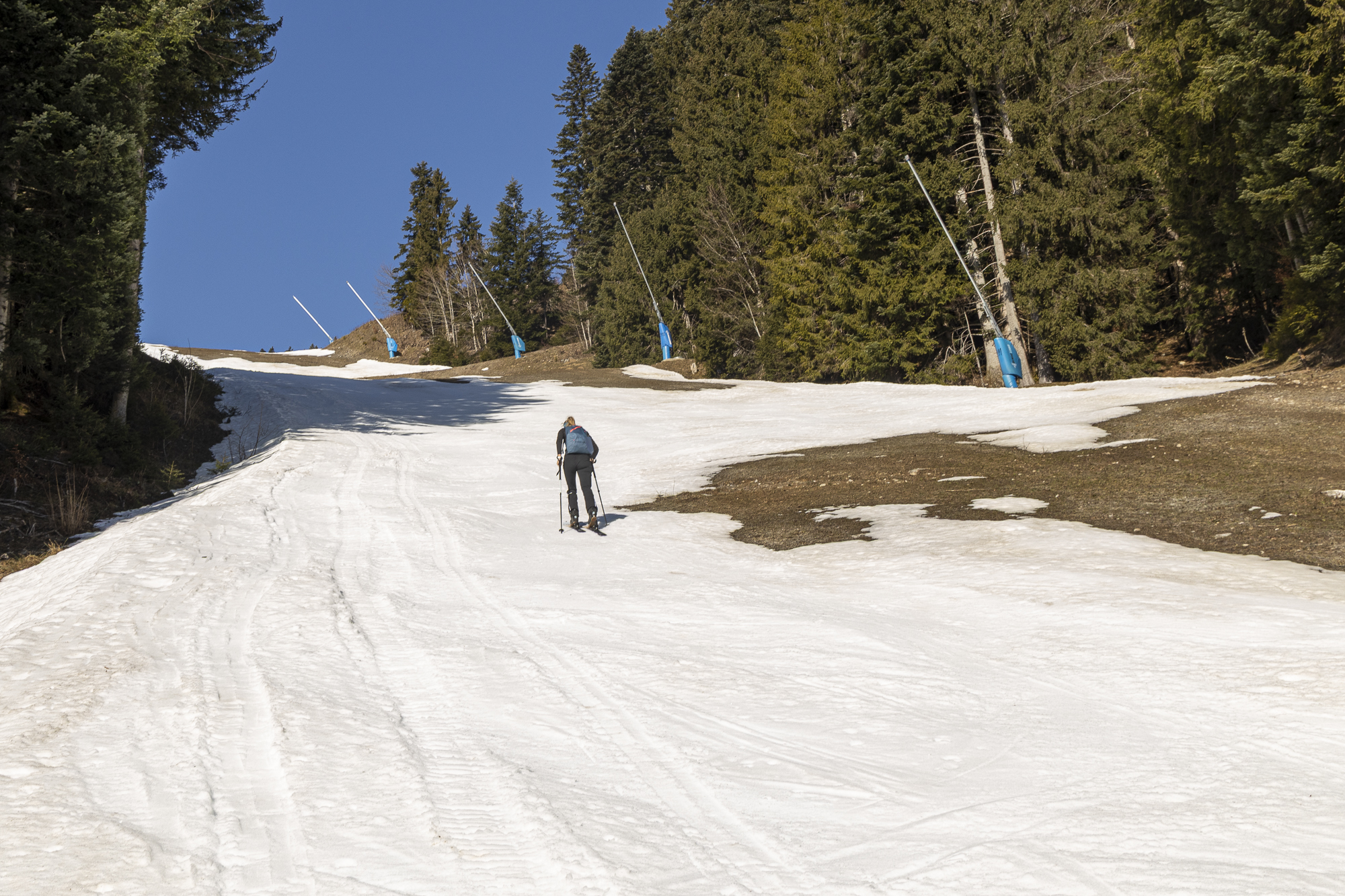 Momentan entlang der Pisten noch brauchbare Bedingungen, die Ausaperung schreitet aber voran.