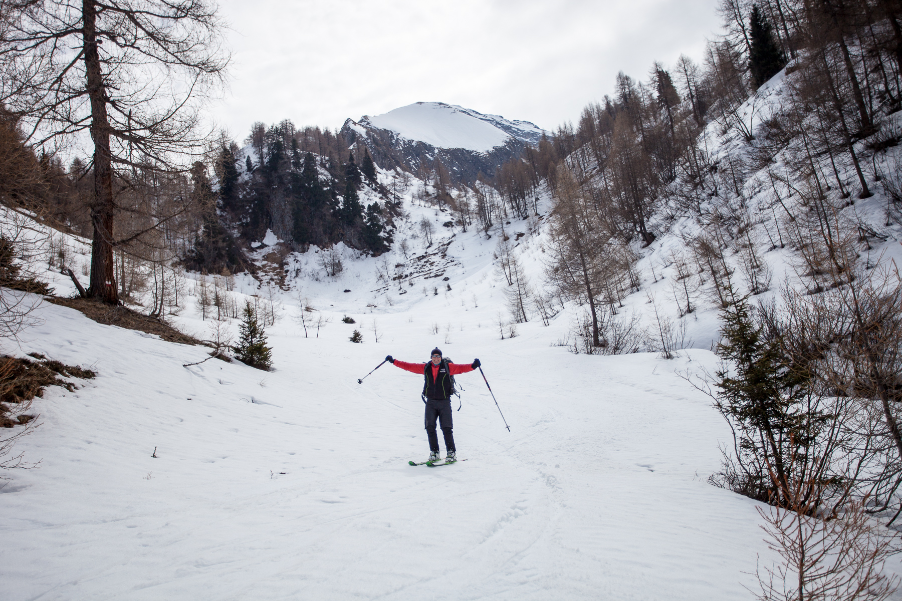 Abfahrt gegen 12 Uhr, Südhang firnig, Nordhang von der Scharte anfangs noch hart, dann ab dem flacheren Teil guter Firn, im Steilhang sogar noch etwas oberflächlicher Pulverschnee auf harter Unterlage. Firn bis zur Waldgrenze, dann Sumpschnee. Tragezeit im Abstieg 20 Minuten, im Flachstück ganz unten konnte man sogar wieder im "Schneepuzzle-Style" bis zum Talboden hinabrutschen.