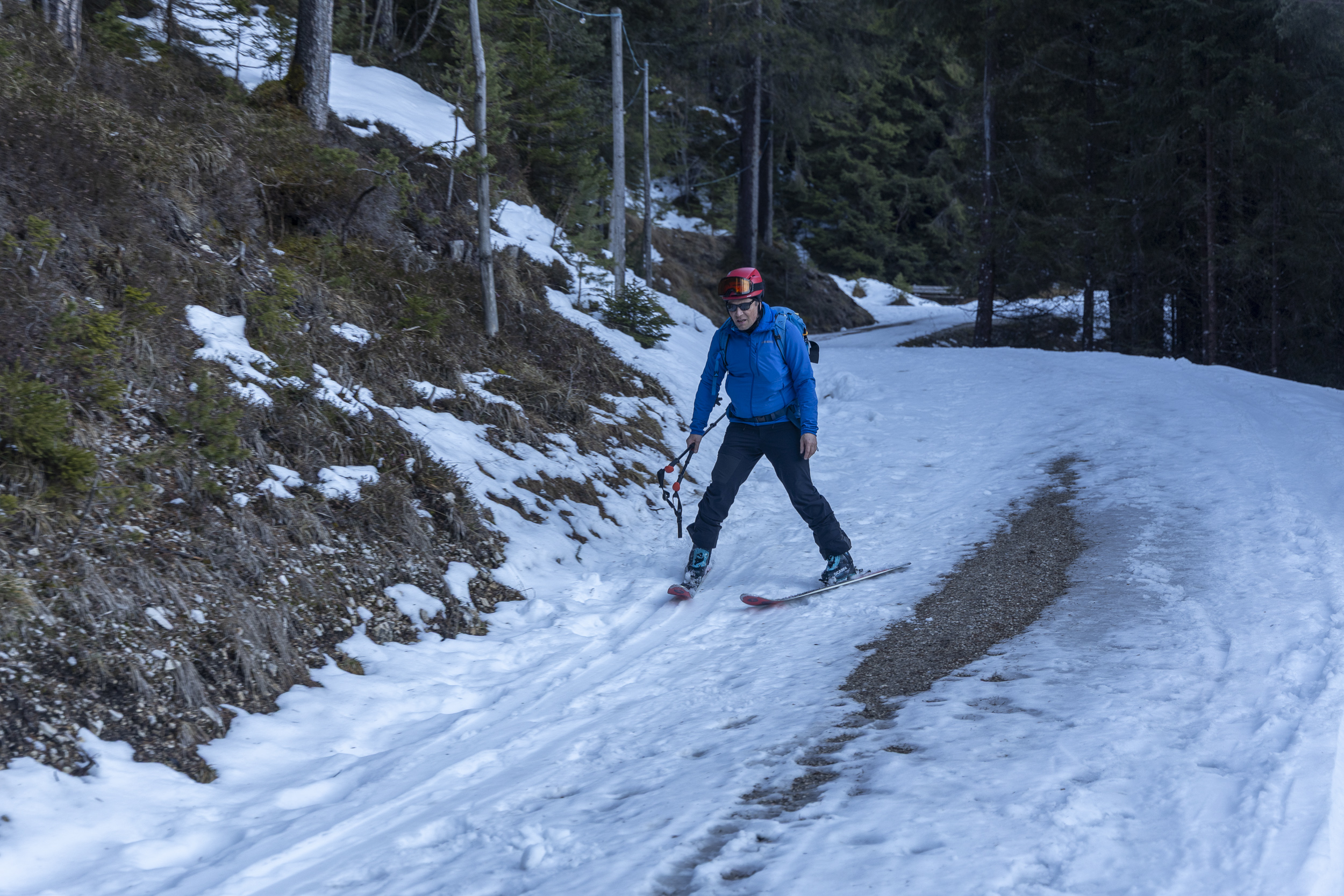 Unterhalb des Neuschnees gibt es eine gute, durchgehende Altschneeunterlage von etwa 50-80 cm. Bei den warmen Temperaturen war der Neuschnee dann in der Sonne heute natürlich komplett durchnässt und ist aus den felsdurchsetzen Flanken als Lockerschneelawine abgerutscht. Ein paar Rutsche wurden auch größer. Wir waren nur im Nahbereich der Hütte bei diversen LVS-Übungen am Werk. Die Schneequalität für Skitouren wäre auf der Höhe um 1800 m heute schlecht gewesen: südseitig tiefer, bremsender Nassschnee, im Schatten eher noch etwas bruchharschig. Wir sind dann am Abend nach 16 Uhr über die Talabfahrt nach Maurach abgefahren. Bis zur Talstation des Sessellifts (ca. 1400 m) war es eine gut fahrbare, sulzige Piste, die im Schatten bereits anfing leicht zu überfrieren. Der folgende Ziehweg in dem südwest- und südseitigen Hang hatte heute noch ausreichend Schnee zum Abfahren. Nur auf einem kurzes Stück von etwa 30 m haben einige abgeschnallt. Ansonsten konnte man mit offenen Augen ohne Bodenkontakt bis zum Ortsrand von Maurach abfahren. Die ersten Ausaperungen in Straßenmitte konnten noch recht einfach umfahren werden. Das dürfte aber bereits ab morgen schlechter werden und spätestens zum Wochenende dürften die Tragestrecken schon sehr lang werden. Oberhalb liegt jetzt aber genug Schnee und der wird auf der Höhe auch die anstehende Wärmephase eine Zeit lang überstehen. Nach klaren Nächten könnten in den nächsten Tagen in Südhängen vormittags schon die ersten “Firnschwünge” möglich sein.