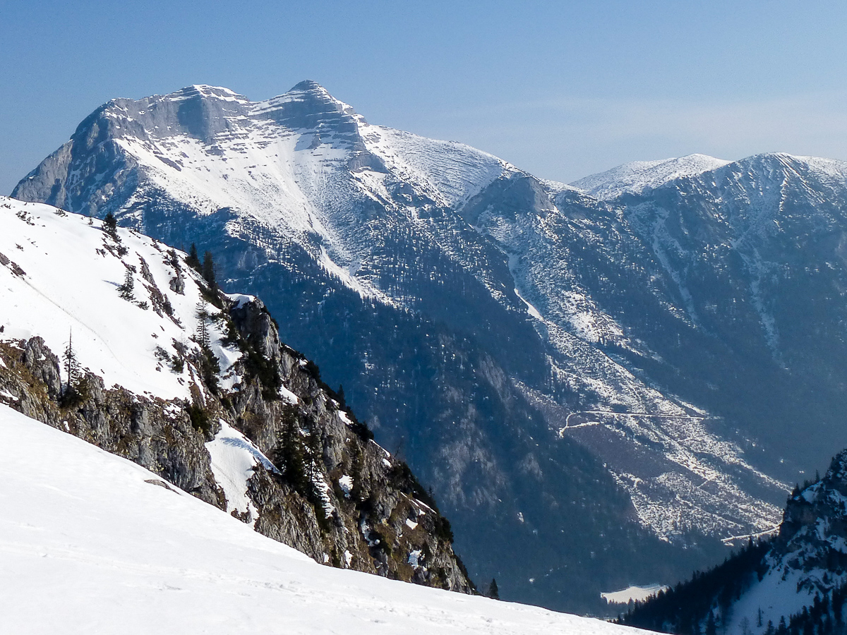 Abfahrt entweder entlang des Aufstiegs oder vom Gipfel kurz und flach Richtung NO abfahren um durch eine anderes, parallel verlaufendes NO Kar abzufahren. Falls keine Spuren vorhanden sind, ist diese Einfahrt nicht leicht zu finden. Auch hier Vorsicht vor Wächten. Für die ersten Meter ist sichere Skitechnik unverzichtbar. Heute vom ersten bis zum letzten Meter ausreichend Schnee. Die Qualität wechselt: von kaum gebundenem Schnee über Harsch bis Firn ist alles geboten. Insgesamt -auch wegen des Ambientes- ausgesprochen empfehlenswert. Zumindest was die Schneemenge betrifft wird das auch vorerst so bleiben. Je nach Tageszeit und Temparatur können Harscheisen vorteilhaft sein. Die letzten Meter des Gipfelgrates wurden heute meist zu Fuß bewältigt. Nimmt man etwas Höhenverlust in Kauf kommt man aber auch bis zum Gipfel mit Ski.