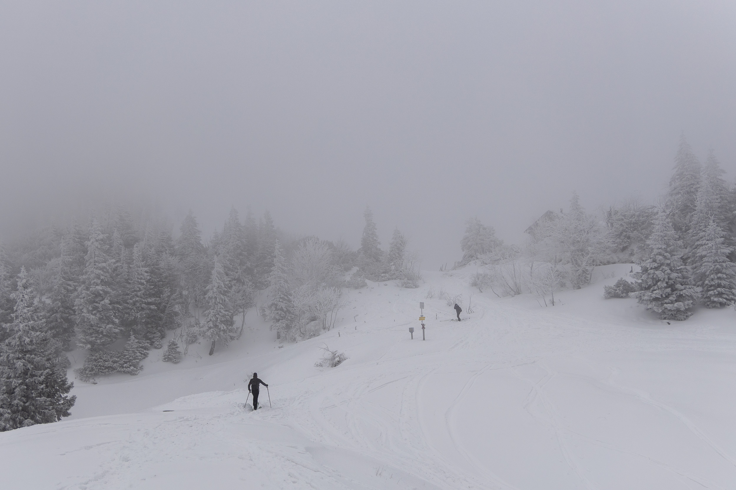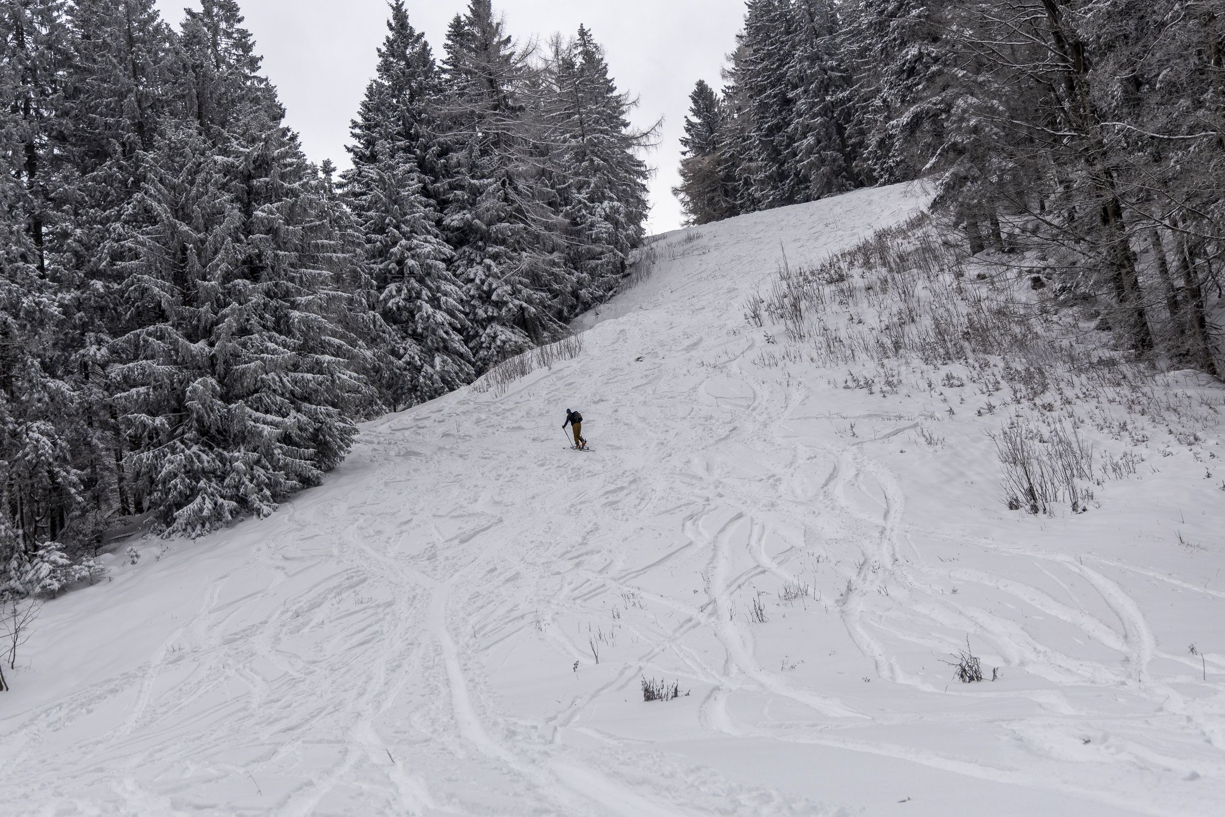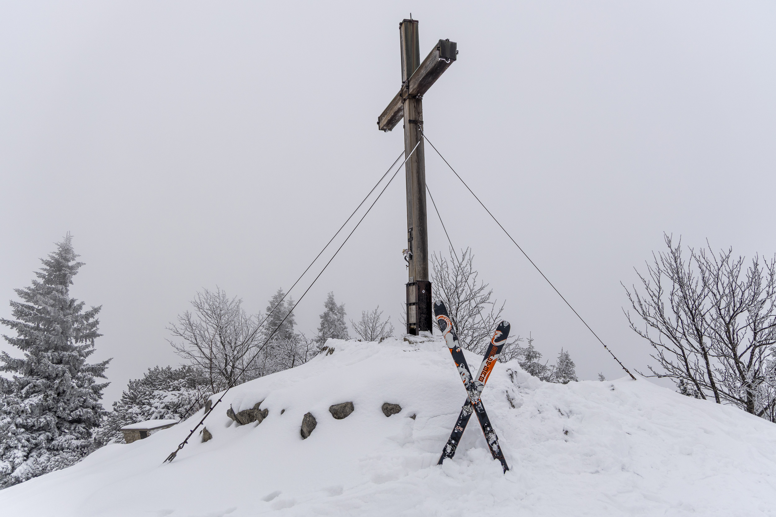 Unten im Bereich der Talstation liegen ungefähr 25 cm Schnee, wobei unter den 15–20 cm Pulverschnee bereits eine dünne, tragfähige Unterlage vorhanden ist. Trotz enorm vieler Tourengeher war auch gegen 15 Uhr der unterste steile Hang noch nicht allzu schlimm abgekratzt, nur an wenigen Stellen kam etwas der Dreck raus. Bis zur Einmündung der Straße von Hintergschwendt insgesamt gute Bedingungen mit etwas Unterlage, aber am Nachmittag natürlich schon recht eingefahren. Weiter oberhalb merkt man, dass es am Freitag – vor dem letzten Schneefall – nicht warm genug war, um den Schnee zusammensacken zu lassen. Hier ist auch die Unterlage noch pulvrig und dementsprechend kommt man etwas öfter auf den Boden durch, besonders wo es steiler ist oder an Hangkanten, die vom Wind abgeweht wurden. Am letzten Stück zum Rossleitenkreuz dürfte es schon noch mehr Schnee haben. Hier muss man bei der Abfahrt vorsichtig sein. Aber mit offenen Augen eigentlich kein Problem, wenn man im ausgefahrenen Korridor bleibt. In den obersten Hängen liegen etwa 30–60 cm Pulverschnee – je nach Windeinfluss (der aber überraschend gering war). Nach mehr Windeinfluss sah es von weitem gegenüber in Richtung Sulten/Steinlingalm aus. Leider war die Sicht aber ganz oben dann weg.