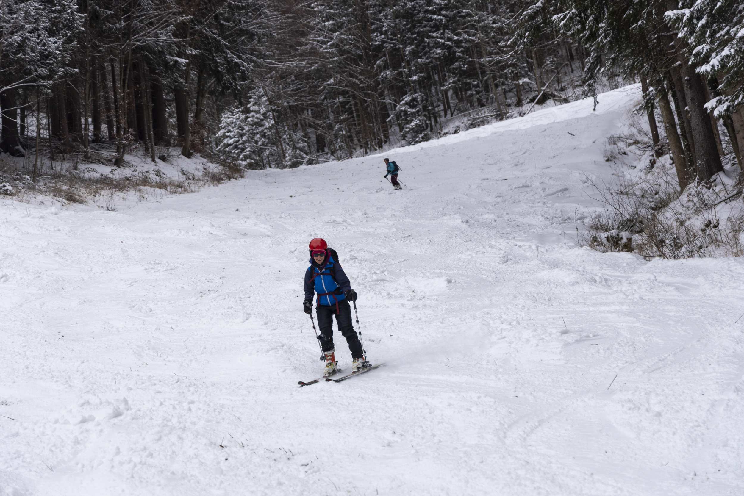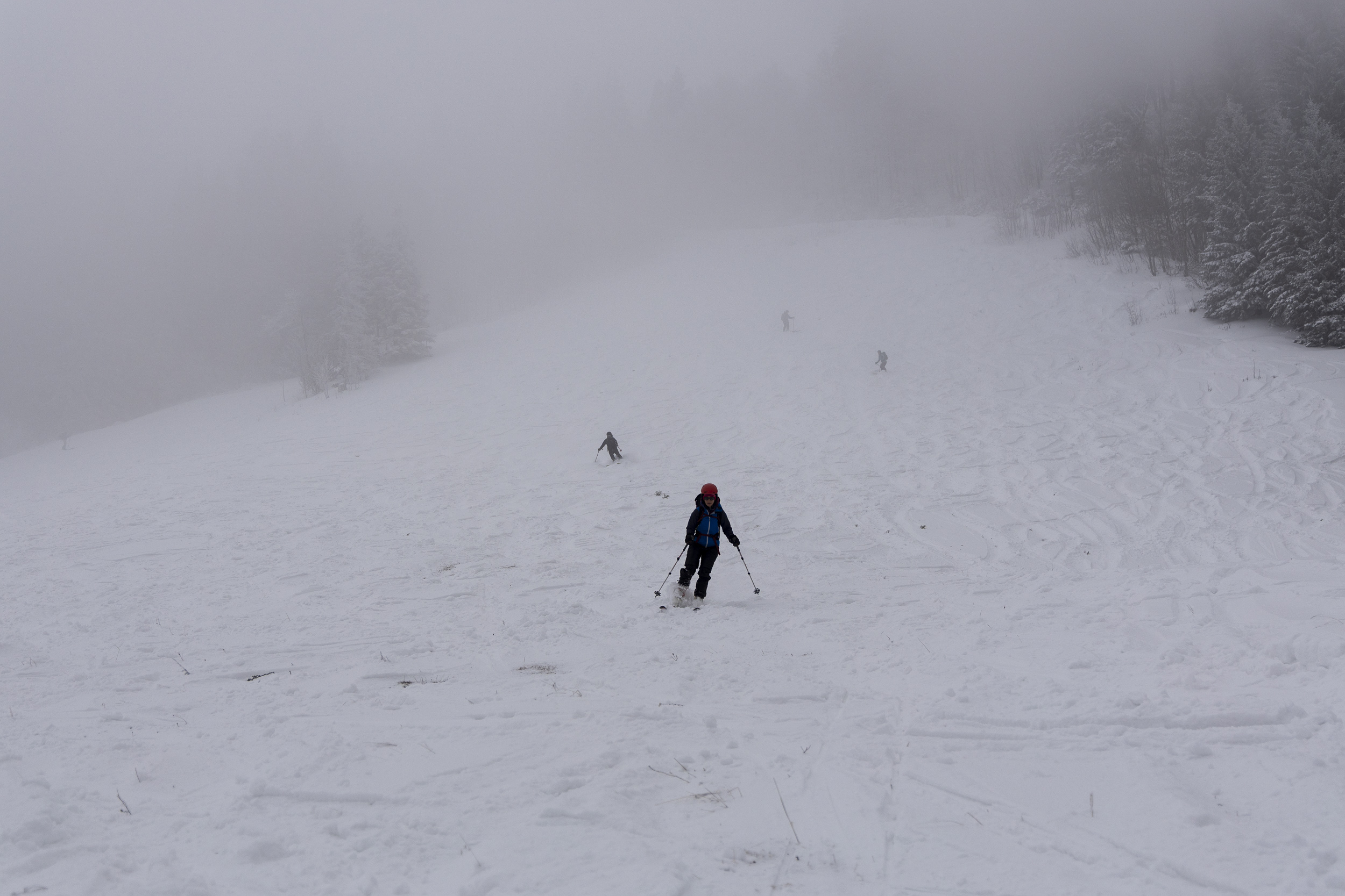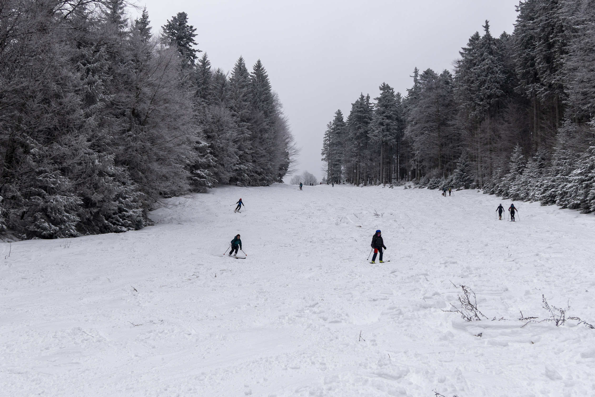 Unten im Bereich der Talstation liegen ungefähr 25 cm Schnee, wobei unter den 15–20 cm Pulverschnee bereits eine dünne, tragfähige Unterlage vorhanden ist. Trotz enorm vieler Tourengeher war auch gegen 15 Uhr der unterste steile Hang noch nicht allzu schlimm abgekratzt, nur an wenigen Stellen kam etwas der Dreck raus. Bis zur Einmündung der Straße von Hintergschwendt insgesamt gute Bedingungen mit etwas Unterlage, aber am Nachmittag natürlich schon recht eingefahren. Weiter oberhalb merkt man, dass es am Freitag – vor dem letzten Schneefall – nicht warm genug war, um den Schnee zusammensacken zu lassen. Hier ist auch die Unterlage noch pulvrig und dementsprechend kommt man etwas öfter auf den Boden durch, besonders wo es steiler ist oder an Hangkanten, die vom Wind abgeweht wurden. Am letzten Stück zum Rossleitenkreuz dürfte es schon noch mehr Schnee haben. Hier muss man bei der Abfahrt vorsichtig sein. Aber mit offenen Augen eigentlich kein Problem, wenn man im ausgefahrenen Korridor bleibt. In den obersten Hängen liegen etwa 30–60 cm Pulverschnee – je nach Windeinfluss (der aber überraschend gering war). Nach mehr Windeinfluss sah es von weitem gegenüber in Richtung Sulten/Steinlingalm aus. Leider war die Sicht aber ganz oben dann weg.