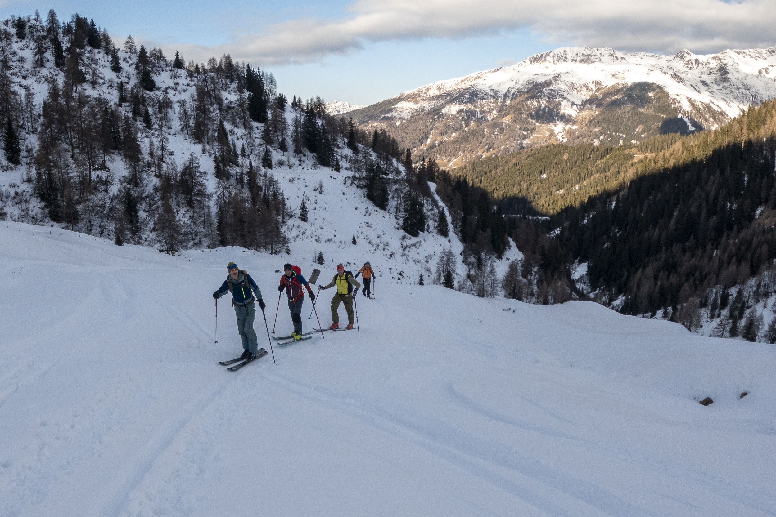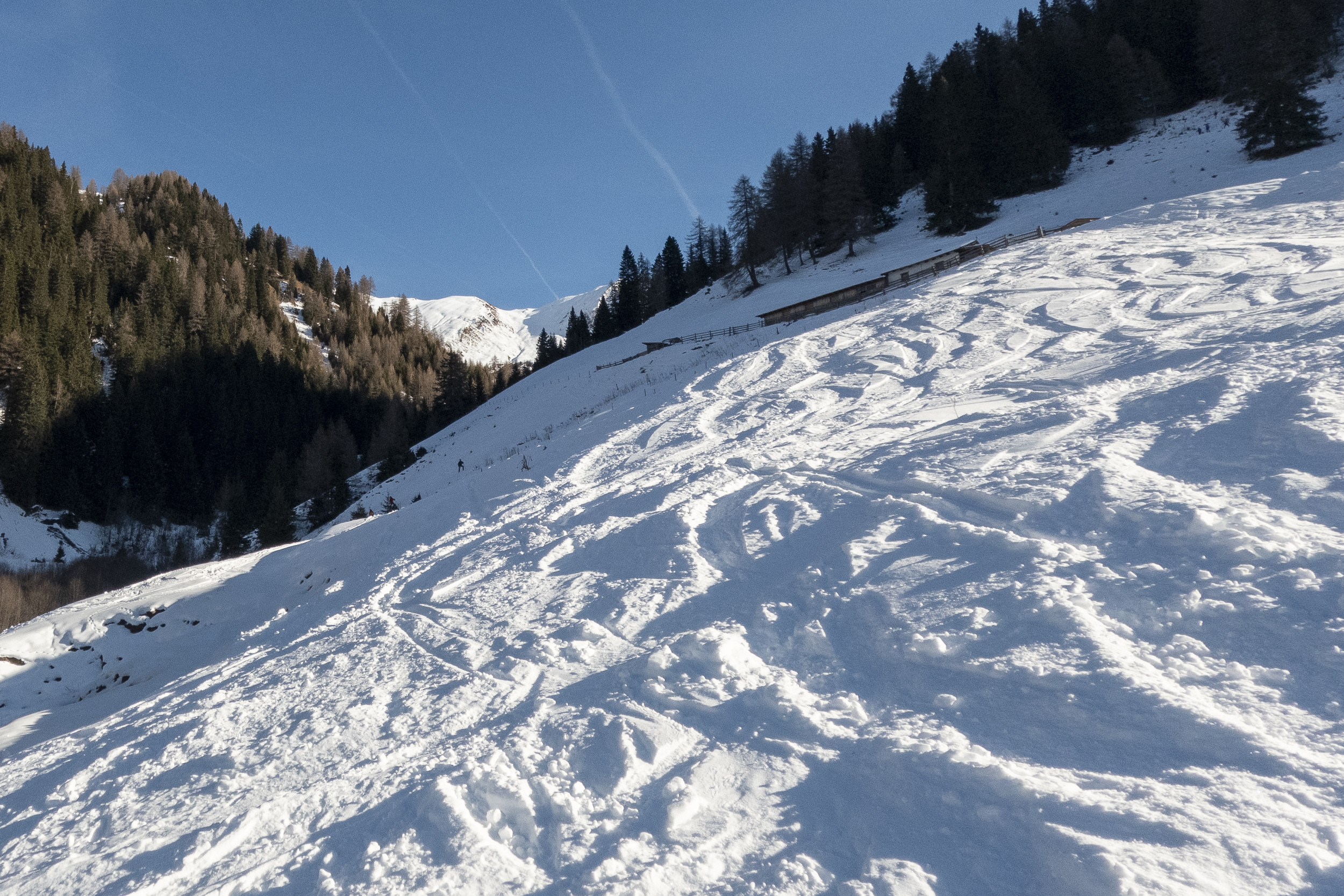 Im Rahmen eines Ausbildungskurses ging es in von Navis in Richtung Silbersattel bis auf etwa 2100 m Höhe (siehe Skitourenführer Tuxer und Zillertaler Alpen, Tour D21). Schneemenge im unteren Teil auf der Fahrstraße ist gerade ausreichend. Im Aufstieg haben wir die große Kehre abgekürzt, die Abfahrt entlang der Straße ist meist gut möglich. Wer neue Ski hat, sollte aber an einigen sehr schneearmen Stellen vorsichtig sein oder evtl. sogar ein paar Meter abschnallen. Am Abkürzer wäre es wohl noch schlechter gegangen. Ab der Weirichalm dann aber gute, tragende Unterlage bis zur Stoffenalm und durchweg pulvrig oder pistenähnlich eingefahren. Oberhalb dann zunehmend aufgebauter Altschnee mit windbeeinflusster Oberfläche, die unterschiedlich hart ist. Zum Teil fällt man bis auf die Stauden durch, stellenweise ist die Oberfläche sehr hart – stellenweise finden sich aber auch Mulden für ein paar schöne Pulverschwünge. Alles in allem für die aktuelle Schneelage gute Bedingungen auf dieser Tour und, solange man sich an die übliche Route hält, auch relativ risikoarm. Größere harte Triebschneepakete sind allerdings sehr kritisch zu beurteilen. Die zahlreichen steilen, eingewehten Rinnen östlich der Aufstiegsroute schätze ich momentan als äußerst heikel ein.