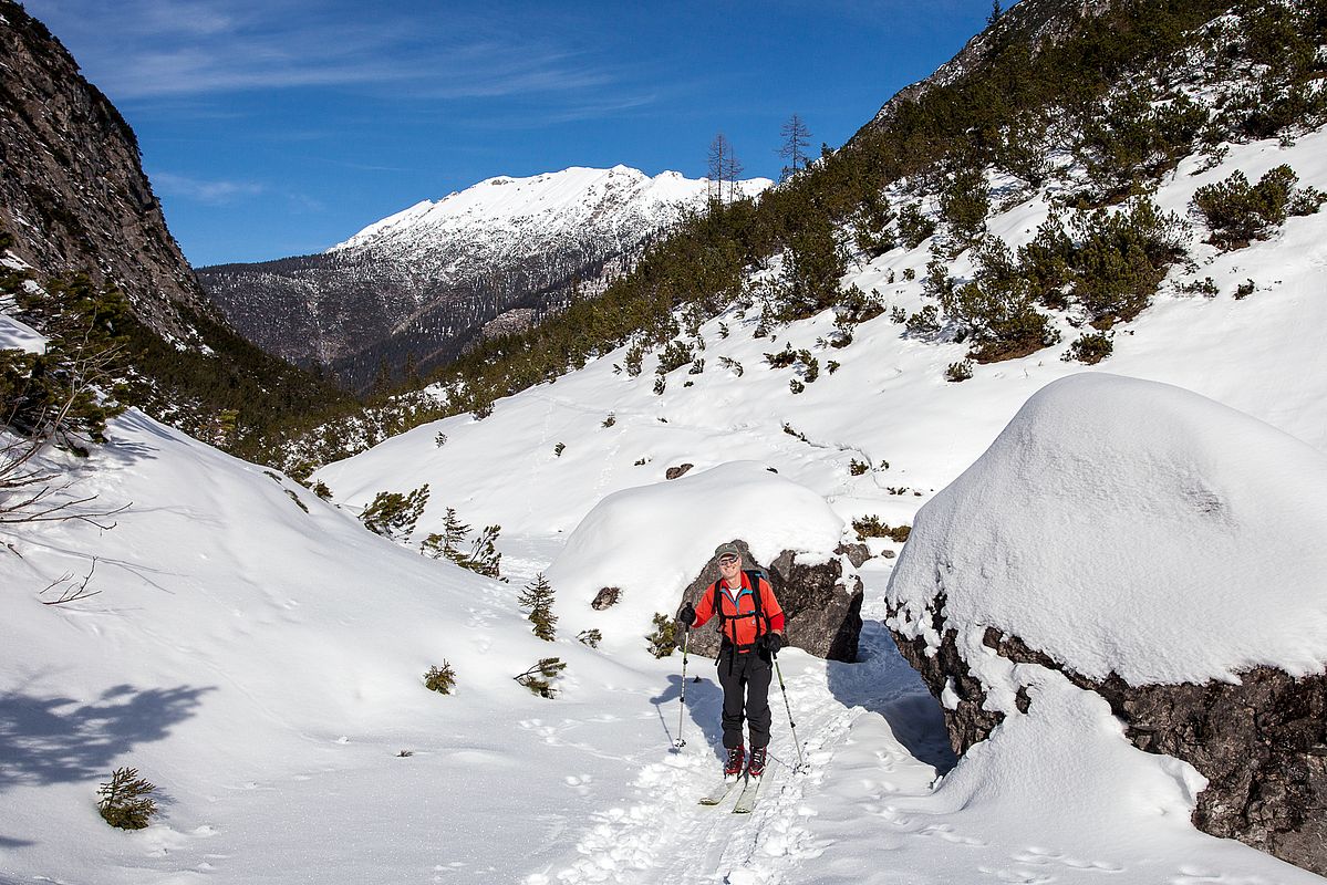 Die Talabfahrten in die Seitentäler waren bei uns alle problemlos möglich. Die Schneelage ist aber insgesamt eher gering, Latschenzonen sind nicht besonderst gut verschneit und in den blockigen Karen des Parzinn muss man den ein oder anderen überraschenden Steinkontakt einkalkulieren, besonders schattseitig, wo der Schnee schon recht aufgebaut ist und wo man deshalb weiter durchfällt. Die Lawinensituation ist insgesamt wenig problematisch, allerdings haben sich durch den Wind einige meist sehr kleinräumige Schneebretter gebildet, die teils sehr leicht auslösbar sind und vor allem in steilem, schattigem Gelände mit Absturzgefahr gefährlich werden können. Lokal findet sich in schattigen Steilhängen auch noch ein latentes Altschneeproblem. Darüberhinaus ist die Gleitschneelawinen-Aktivität auf den Sonnenseiten überall sichtbar.