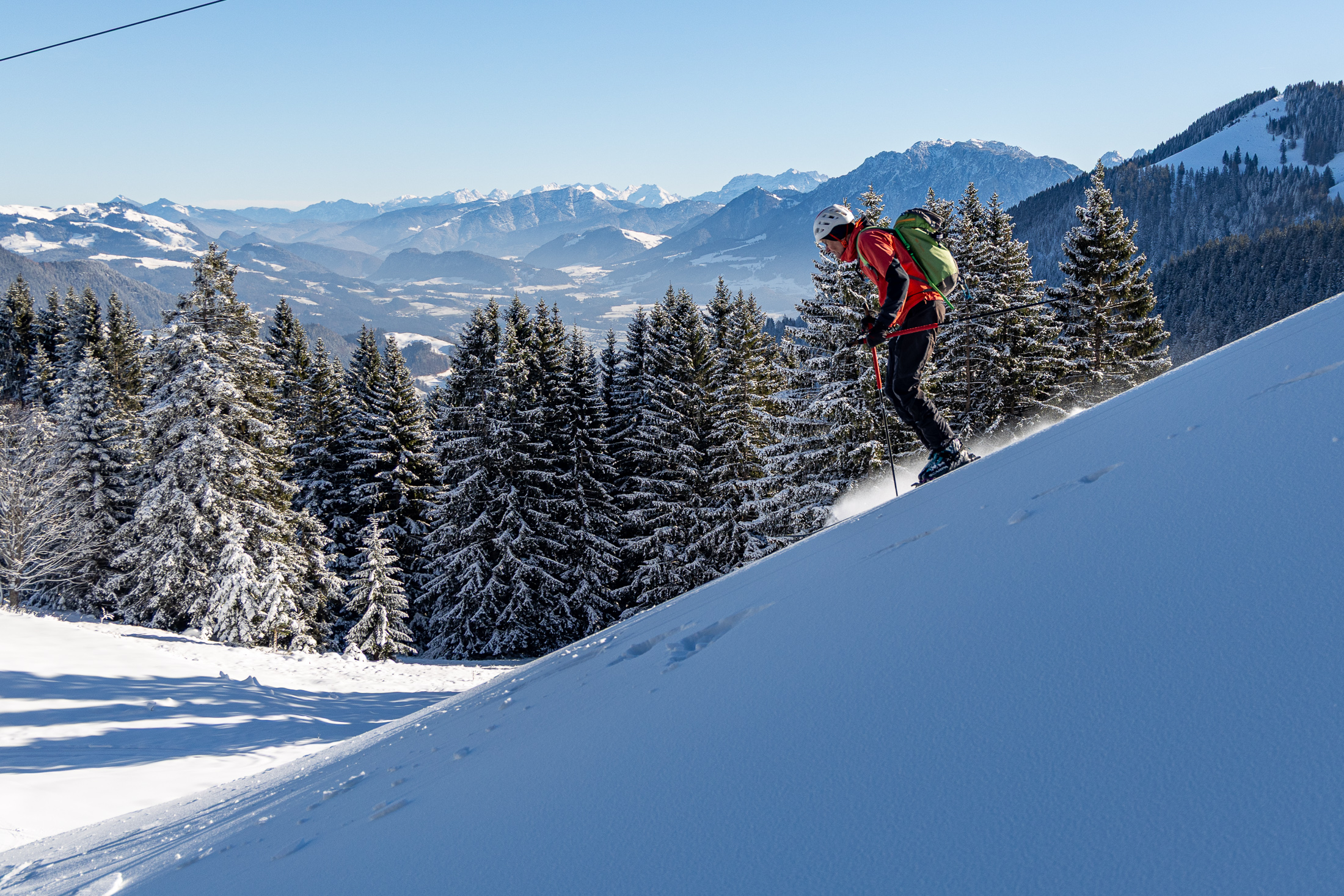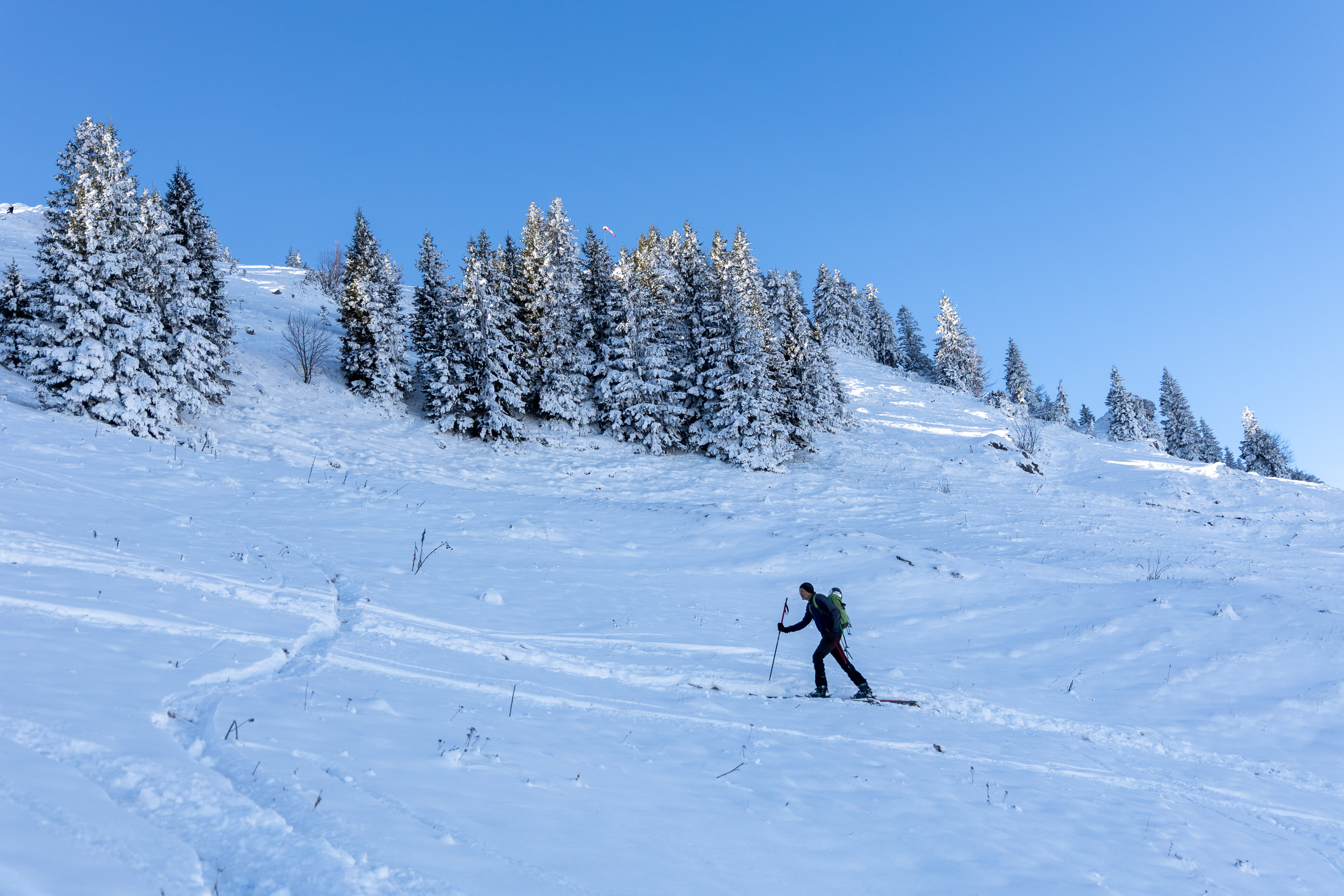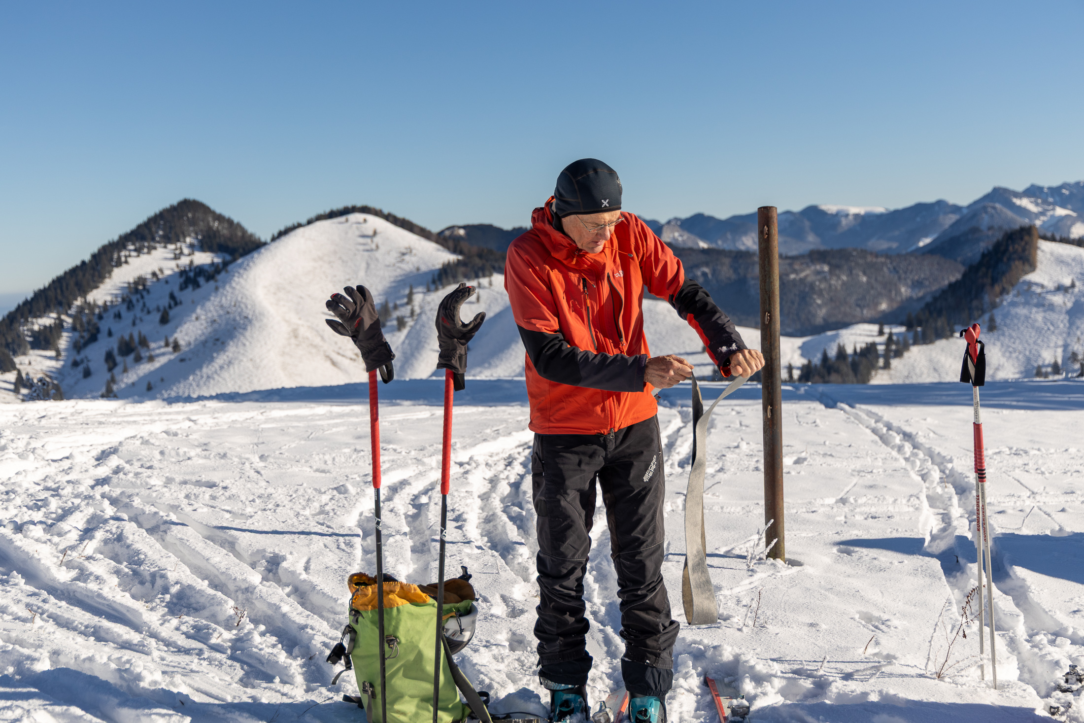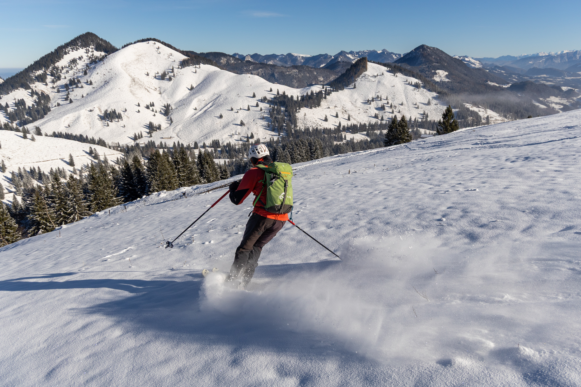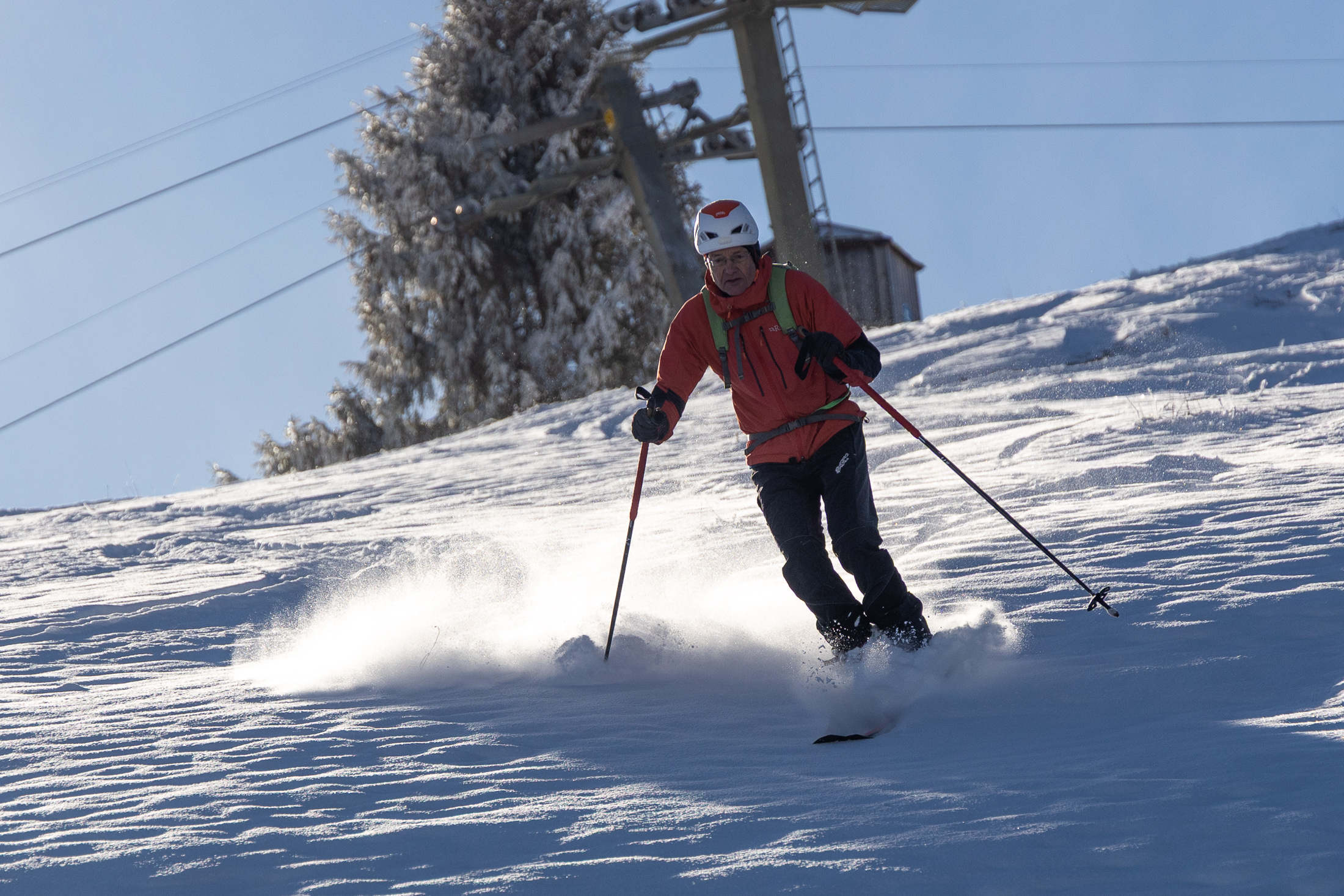 Ansonsten sollte der Fokus momentan noch beim Aufstieg liegen, was tadellos geht. Nur das letzte Stück auf den Vogelsang sind wir zu Fuß auf- und abgestiegen, dort ist es dann doch recht steinig. Heute haben hier zahlreiche Tourengeher ihren Saisonauftakt zelebriert. Wir sind vom Waldkopfparkplatz in einem Linksbogen (ohne Schneekanonen) auf den Waldkopf gestiegen, dann ein Stück nach Südosten abgefahren und über die Speckalm auf den Vogelsang. Von dort Abfahrt zur Grafenherberge, nochmals auf den Waldkopf und zurück zum Ausgangspunkt (gut 700 Hm im Aufstieg).