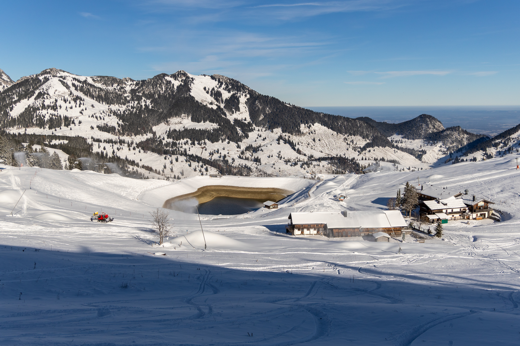 Das Skigebiet ist natürlich noch geschlossen, und es sind auch noch keine Pisten präpariert, aber die Schneekanonen liefen heute auf Hochtouren. Die Mengen an Naturschnee am Sudelfeld sind wie erwartet noch sehr überschaubar. Es liegen etwa 10–15 cm Schnee, stellenweise vielleicht 20 cm. Zudem handelt es sich um lockeren Pulverschnee, der ohne Unterlage locker auf dem Untergrund liegt. Dort, wo Grasboden ohne Steine und mit wenig Unebenheiten die Unterlage bildet, lässt es sich ganz nett mit Ski talwärts fahren, ebenso auf der Fahrstraße/Rodelbahn, wo der Schnee gut zusammengetrampelt ist. Witzig zum Fahren sind auch die Kunstschneehaufen, besonders in Richtung Grafenherberge - wobei aber der Übergang vom harten Kunstschnee zum fluffigen Naturschnee jeweils kurz Bruchharsch ist.