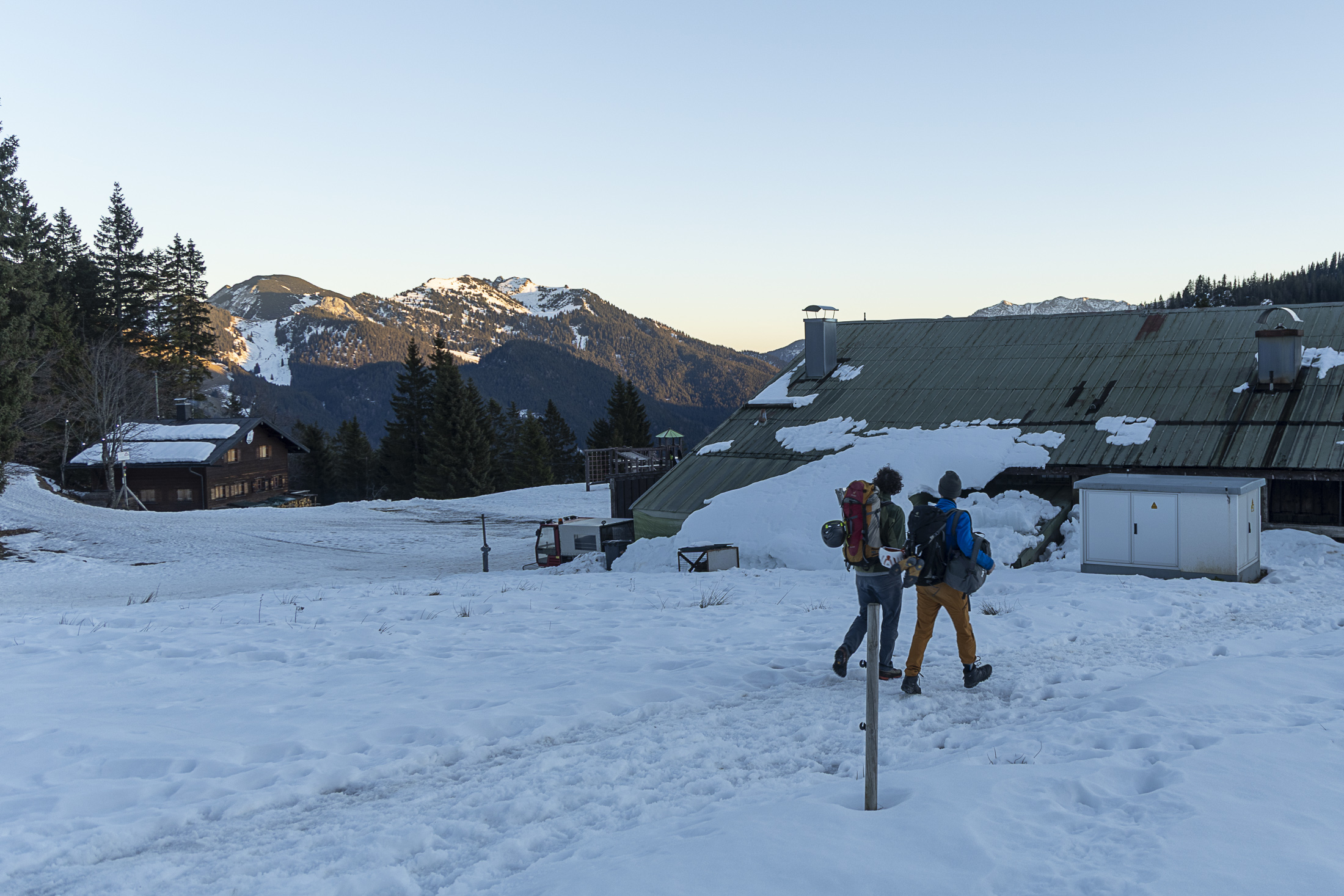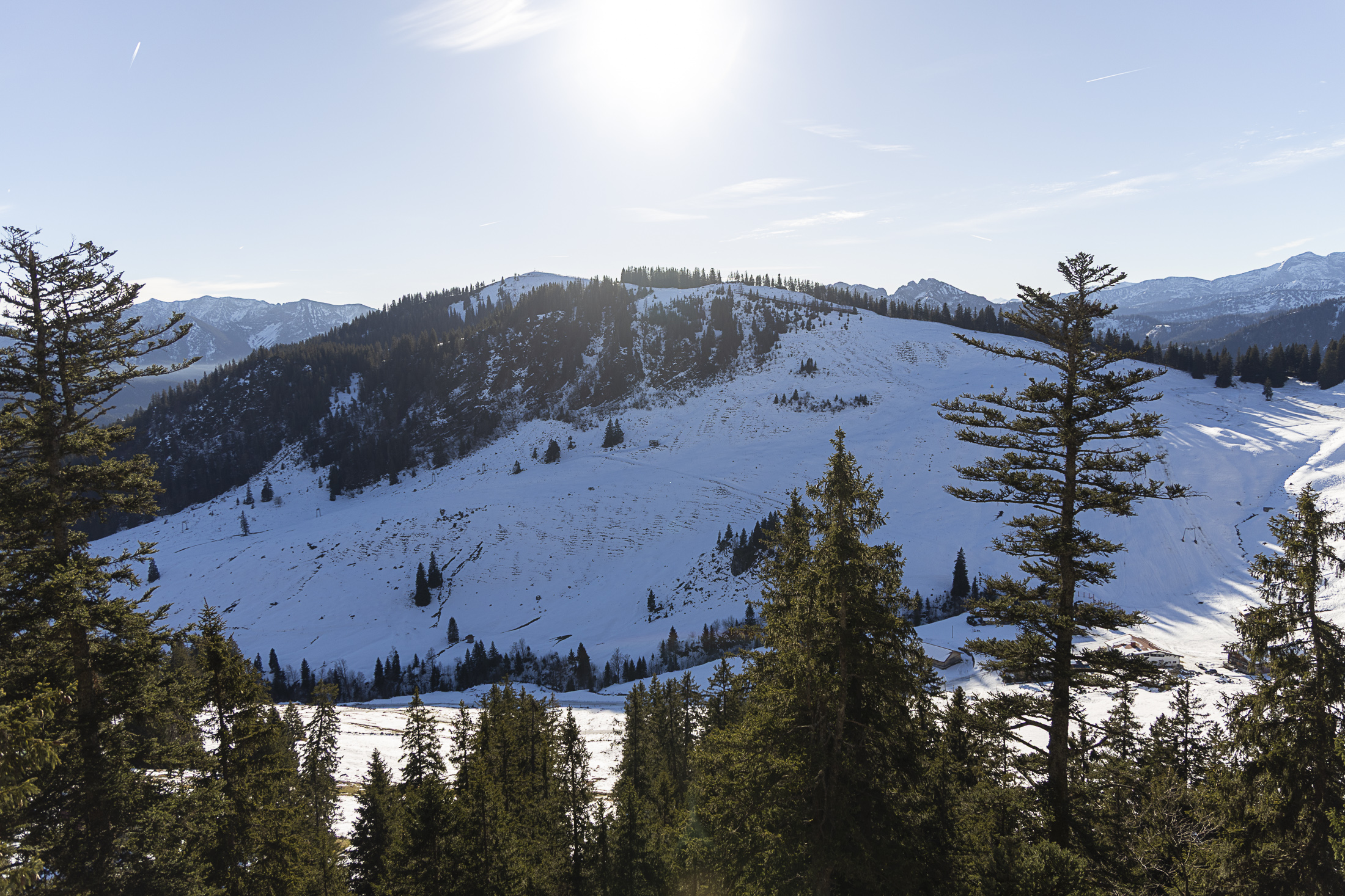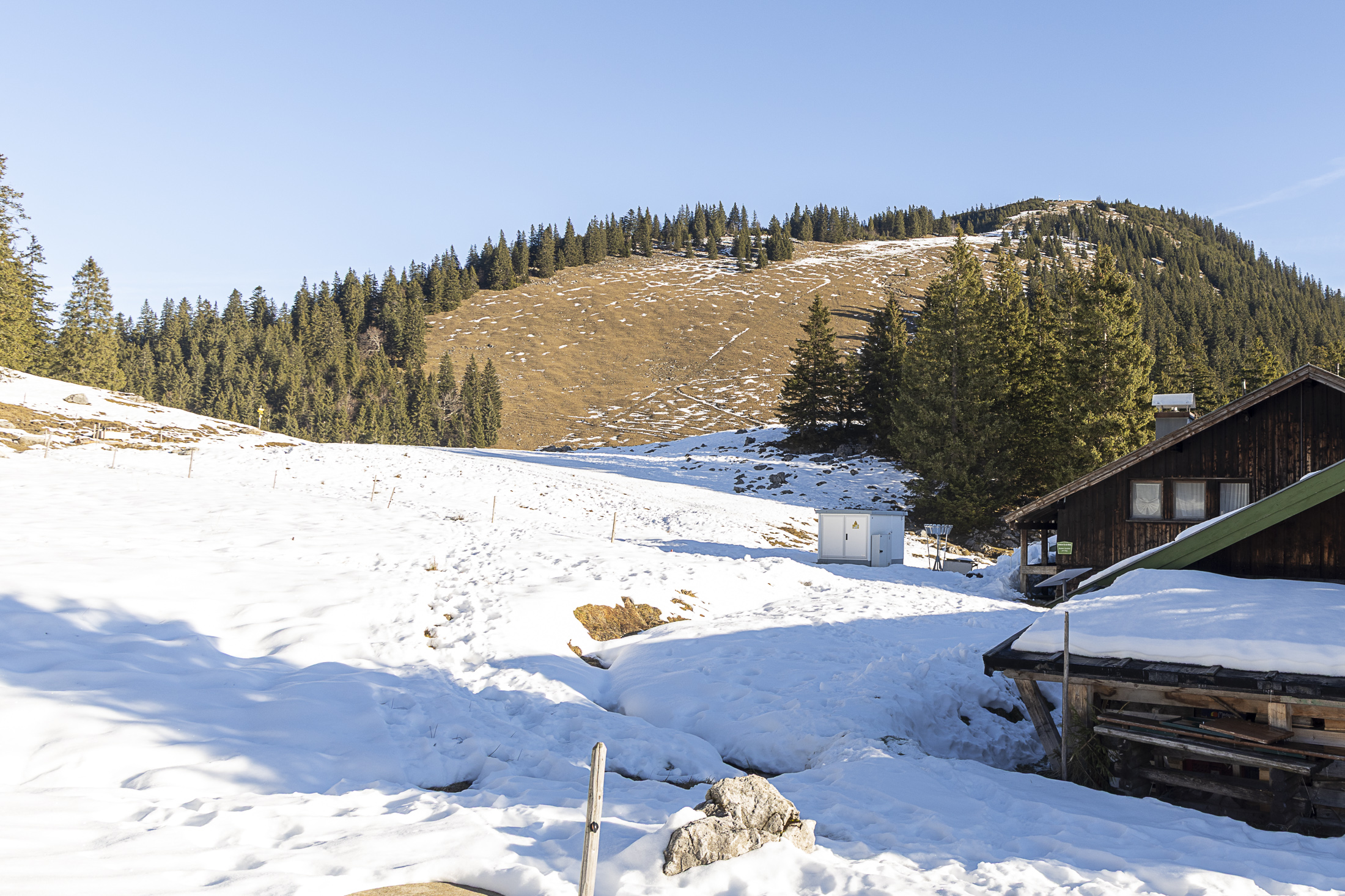 Skitouren im Spitzinggebiet sehe ich derzeit kaum noch als lohnend an. Schattseitig liegt zwar noch eine gerade so geschlossene Schneedecke bis unten hin, aber abseits der Piste ist die Schneequalität schlecht (Bruchharsch). Sonnseitig hätte es tragfähig verharschten Schnee, allerdings sind hier die meisten Hänge bereits ausgeapert und nur noch einige nicht mehr zusammenhängende Schneeflecken vorhanden. Was vermutlich als „Brechstangen-Skitour“ geht, ist der Aufstieg vom Kurvenlift auf den Stümpfling und die Abfahrt über Dreitannen (oder einamer: Der Aufstieg von dieser Seite) bzw. Abfahrt über die beschneite Piste zur Talstation des Stümpflinglifts. Der untere Teil der Kurvenliftabfahrt dürfte schon sehr abgekratzt sein. Ein weniger schönes Gestopsel in bis zum Grund ausgeschabten, eisigen Buckeln erwarte ich auch am Gipfelhang des Rosskopfs und am Taubenstein/Lochgraben, auch wenn beides mit alten Ski und entsprechendem Willen möglich sein dürfte. Eine Abfahrt am Raukopf ähnelt aktuell vermutlich eher Skifahren im Rangierbahnhof.