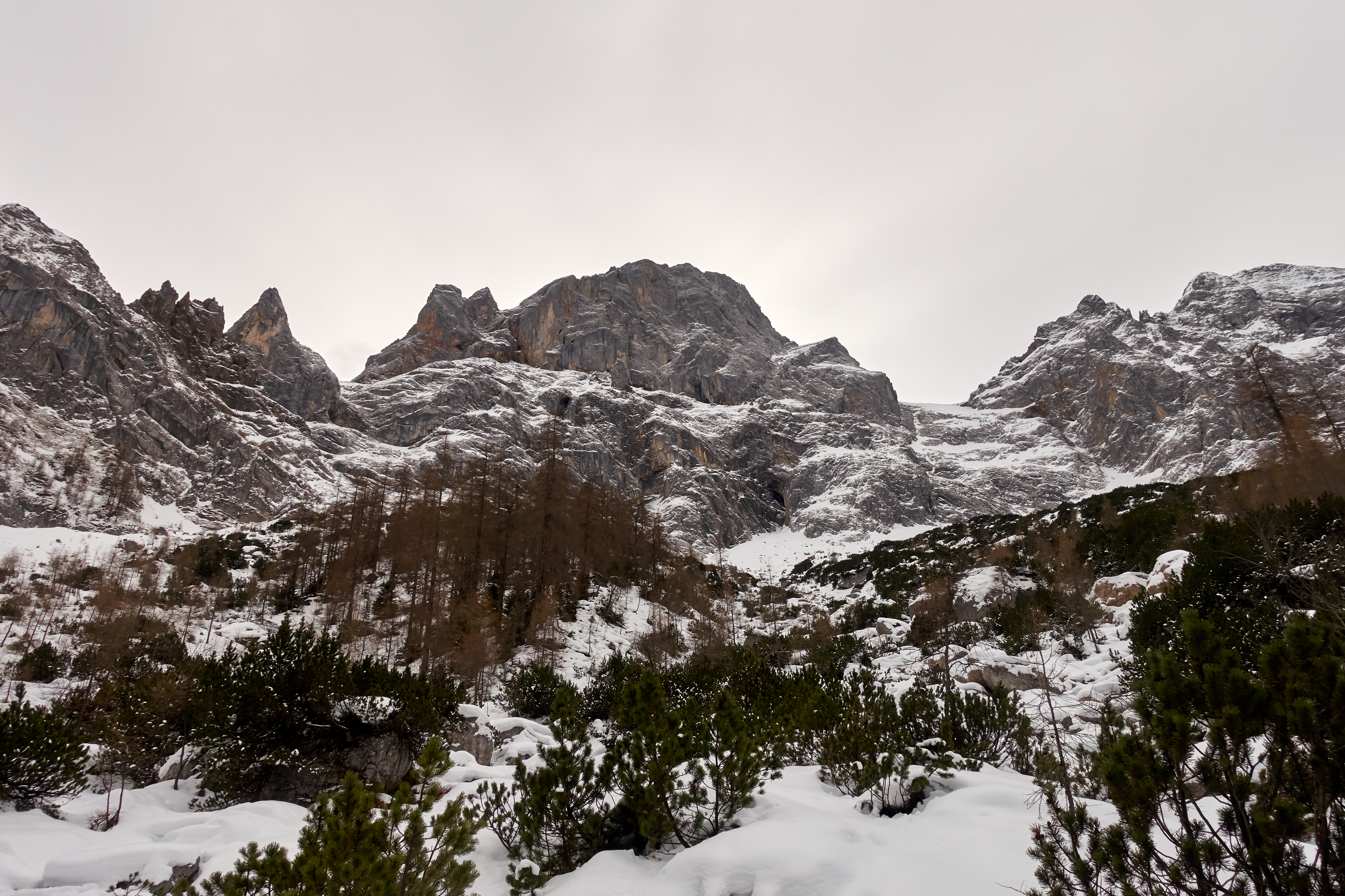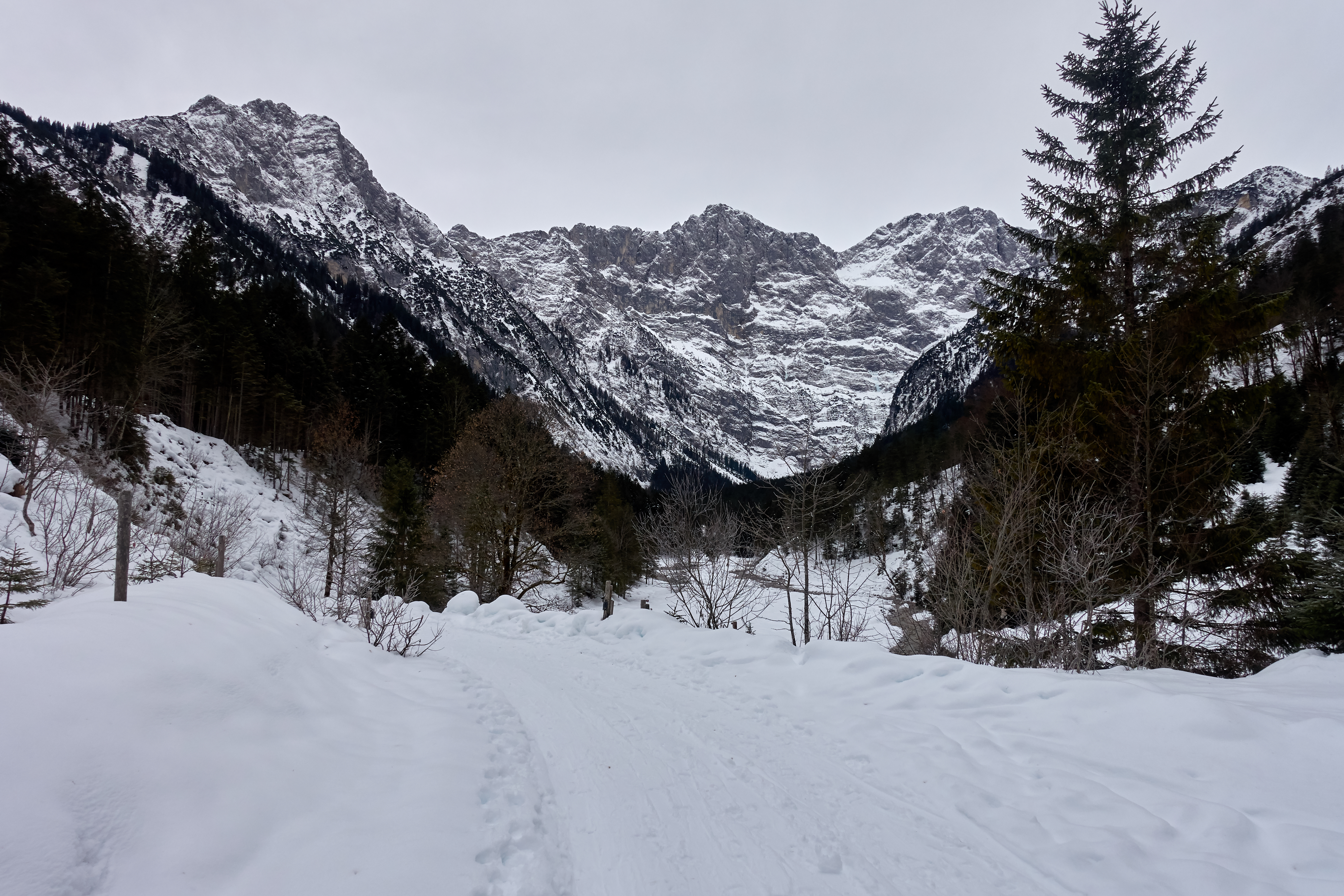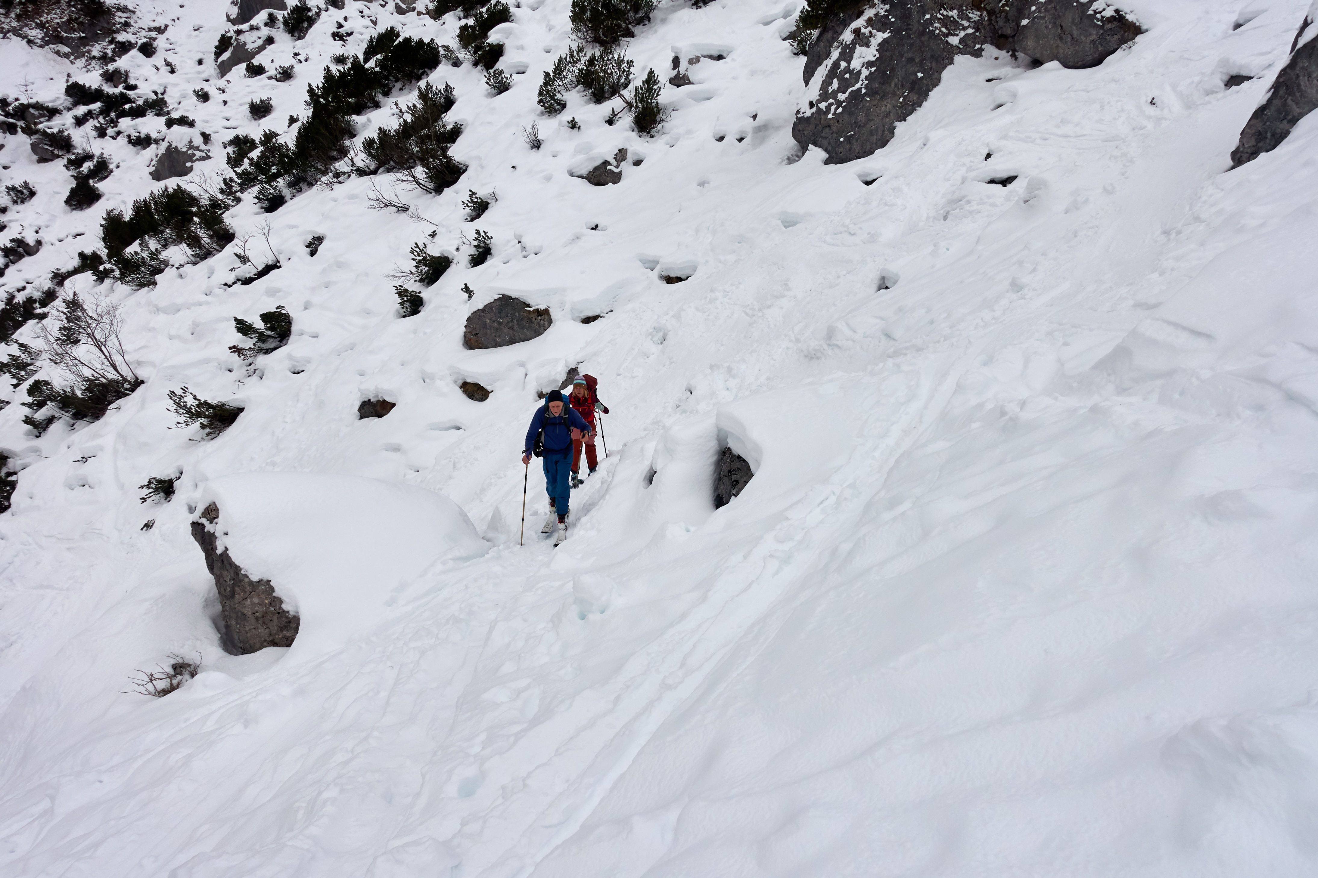 Heute sind wir zur Torscharte im Vorkarwendel, rauf über's Tortal, herunter via Rontal. Unten in Hinterriß schaut's auf den ersten Blick gar nicht so schlecht aus, im Talboden hat es ca. 20-30 cm Altschnee. Auch der Anstieg durch das Tortal in die Torscharte geht komplett und problemlos mit Fellen, auch wenn weiter oben im Kar mächtig große Steine herausschauen. Die Torscharte selbst war ziemlich abgeblasen, runter in's Rontal hatte es dann echt grenzwertig wenig Schnee, der eigentlich vollständig in ein paar Rinnen geweht war, alles andere war komplett abgeblasen. Wir haben uns dann recht vorsichtig nach unten gearbeitet, immer bemüht, zu viel Stein- und Latschenkontakt zu vermeiden. Erst unten im flachen Talboden bei der Rontalalm lag dann wieder schön Schnee, allerdings ist der Talboden so flach, dass man nur in alten Spuren vorwärts kam. Die Forststraße ins Rontal war dann leider ab der Wildfütterung geräumt, so dass wir die letzte 10 Minuten die Ski hinunter nach Hinterriß getragen haben. Fazit: es war ein schöner Tag, aber es braucht definitiv noch eine gute Menge Schnee bis diese Tour gut geht.