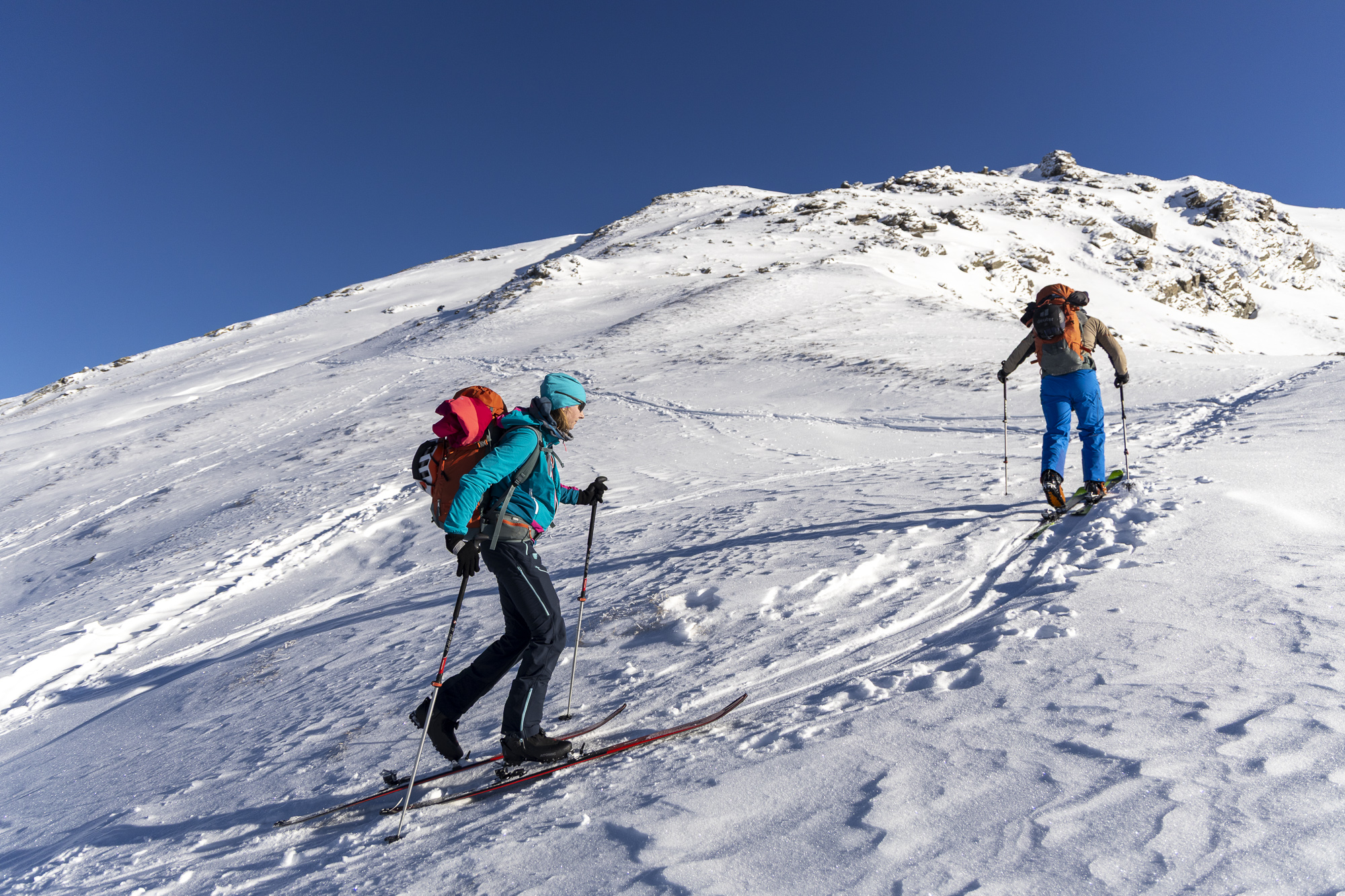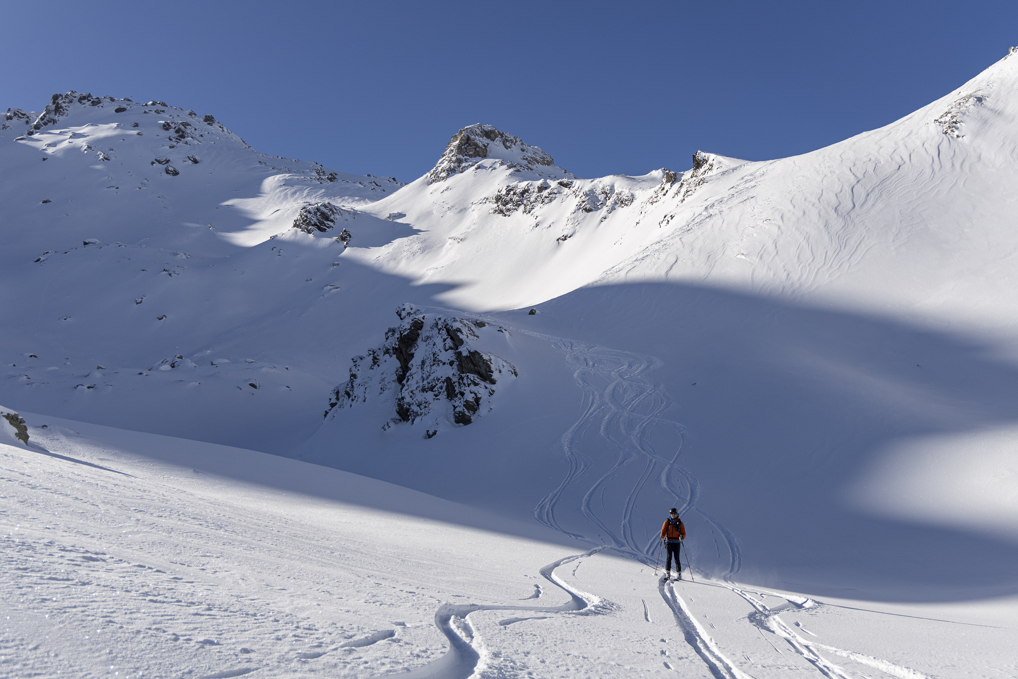 Westseitig stark abgeweht und wenig Schnee, angespanne Lawinenlage bei der Ostabfahrt.