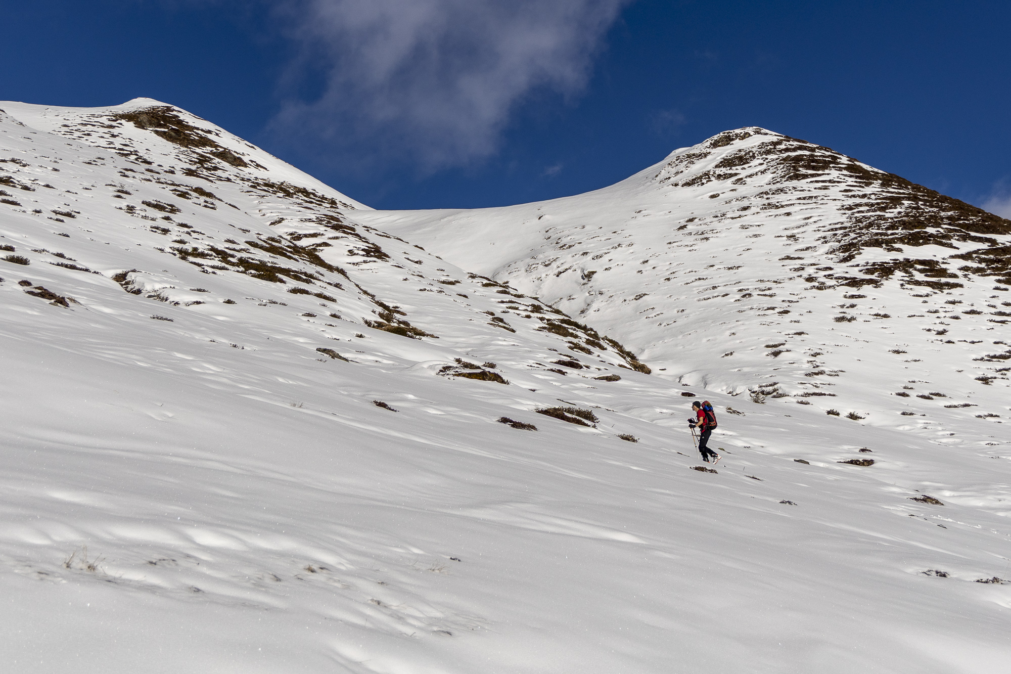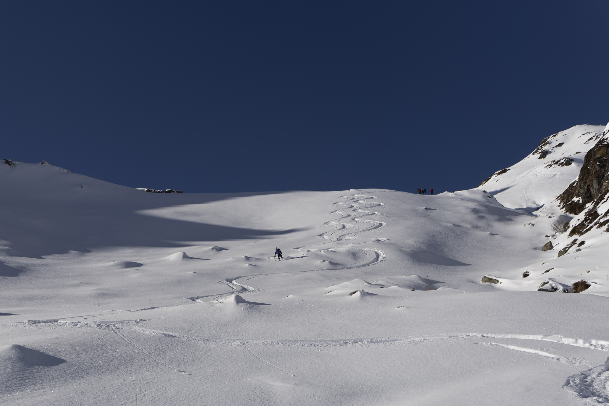 Wie erwartet war die Schneelage sehr unterschiedlich. Die Westhänge von der Lizumer Hütte zur Torspitze sind sehr abgeblasen und sehen wenig einladend für eine Skitour aus, wenngleich einige Mulden sicher ganz nett zu fahren wären. Allerdings gab es auch hier bereits Setzungsgeräusche in bis dato unbetretenem, flachem Gelände. Der Nordrücken war mit offenen Augen gut fahrbar, wenn man offensichtlich überschneite Steine weiträumig vermied. An der kurzen Steilstufe überlegten wir lange, kamen aber zum Schluss, dass rechts des offensichtlichen Triebschneepakets im weitgehend spannungsfreien Altschnee eine vertretbar sichere Abfahrt möglich ist. Auch im weiteren Verlauf hinab zur Vallruggalm konnten wir die kurzen Steilstufen im flacheren Gelände oder auf Geländerücken mit spannungsarmem, aufgebautem Altschnee umfahren, immer wieder begleitet von Setzungsgeräuschen in den Mulden. Es folgte eine lange Querung in Richtung Geiseljoch auf der gerade ausreichend mit Schnee bedeckten Straßentrasse in den sonst aperen Südhängen. Der Südanstieg zum Hobarjoch (Tour B20 oberer Teil) hat wenig Schnee, so landeten wir auf dem südöstlichen Vorgipfel. Die nordostseitige Abfahrt wäre im Bereich der sichtbaren alten Spuren vermutlich vertretbar gewesen, wir entschieden uns aber für die sicherere Variante übers Geiseljoch und die gut eingefahrene Standardroute hinab zur Weidener Hütte. Allgemein ist die Schneelage rund um die Weidener Hütte eine Spur besser als in der Wattener Lizum, zudem sind viele Hänge weniger steinig.