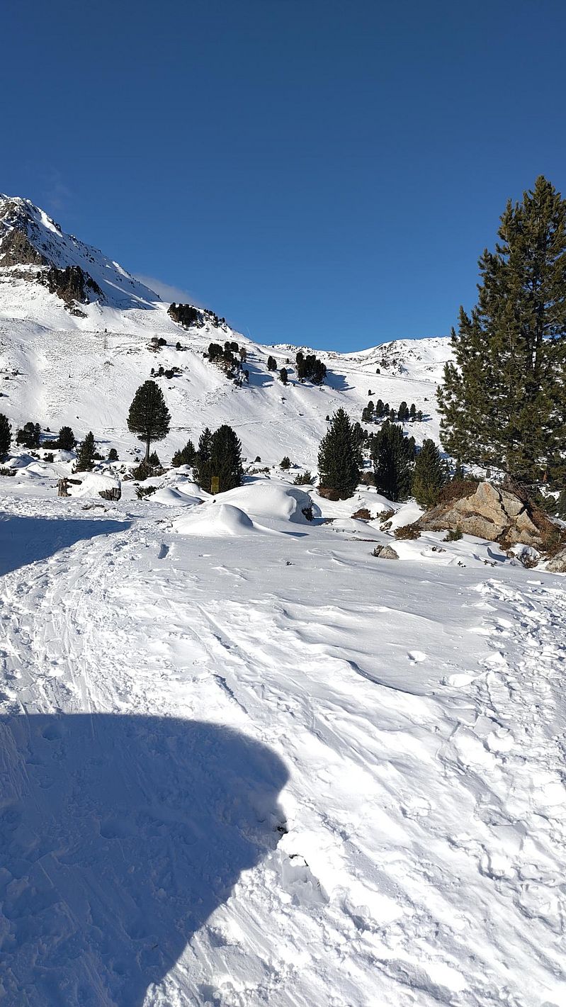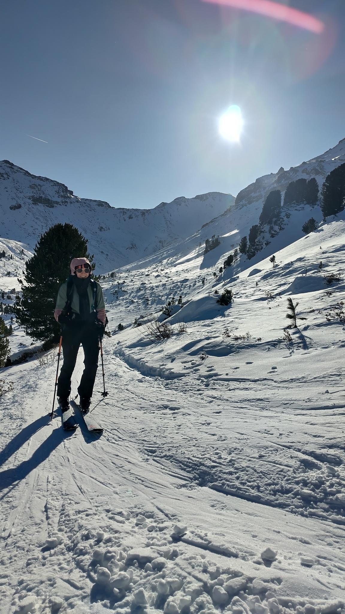 Zuerst die gute Nachricht, man kann vom Parkplatz gut mit Ski zur Hütte hochgehen. Im Tourengebiet dann wenig Schnee, sehr verblassen. Schneequalität mäßig und oft windgepresst. Man kann zu einigen diversen Gipfeln aufsteigen und hat überall Schnee zum gehen, aber bei der Abfahrt muss man sehr genau schauen. Die Schneestabilität ist auch sehr schlecht: Triebschnee und ausgeprägte Schwachschicht vorhanden. Für Ausbildung OK, tolle Skitouren sind was anderes.