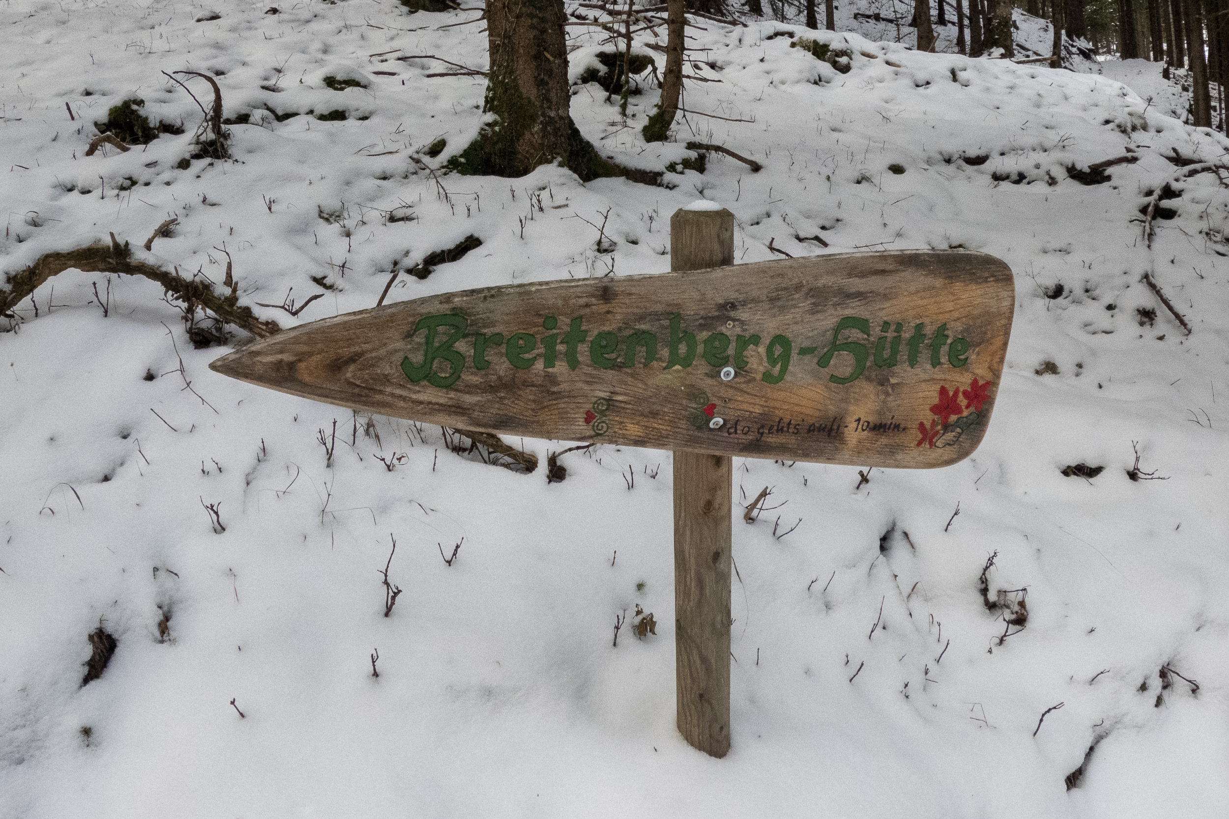 Ich bin also wieder einmal von St. Margarethen über das Breitenberghaus und die Lechneralm auf die Hochsalwand. Die Schneelage ist für fast Mitte Januar schon sehr ungewöhnlich. Während in Brannenburg unten auf 500 m ü. NN der Schlittenhügel gut frequentiert wird und offensichtlich brauchbare Verhältnisse aufweist, wird die Schneemenge auch über 1000 m höher bis zum Gipfel der Hochsalwand (1625 m) nicht nennenswert mehr. Selbst in der steilen Nordflanke liegt so gut wie kein Altschnee und die gesamte Neuschneemenge aus der aktuellen, kalten Woche beträgt ungefähr 10–20 cm. Dafür sah die Rodelbahn vom Breitenberghaus schon ganz passabel aus – mit weiterem Neuschnee sollte sie jetzt dann gut fahrbar sein.