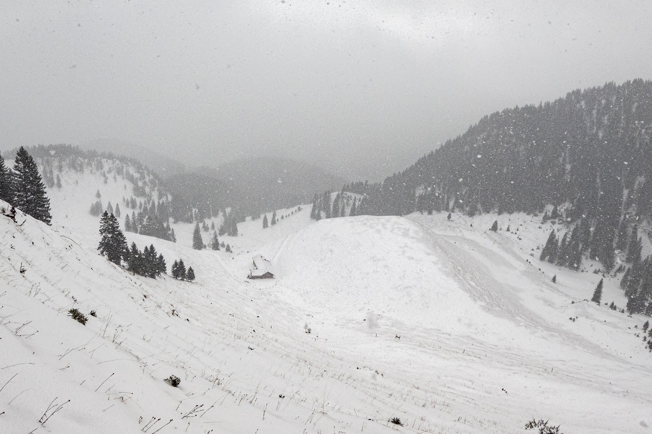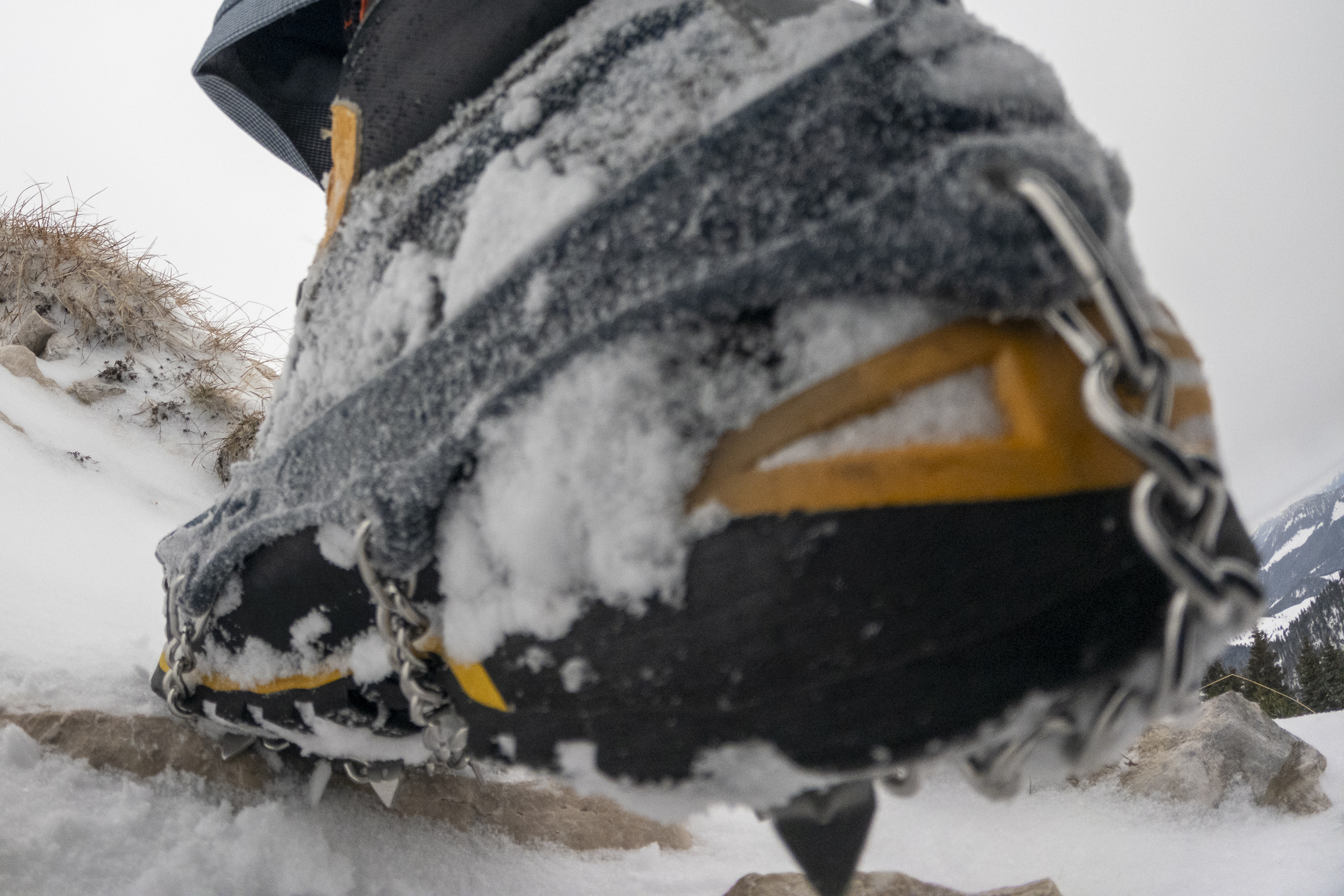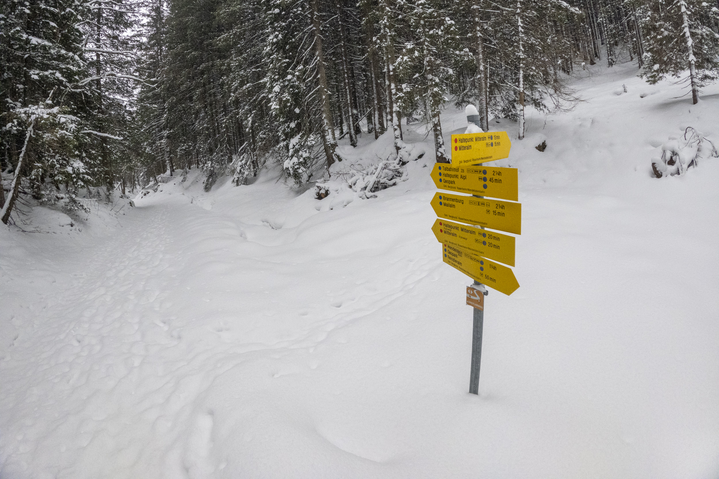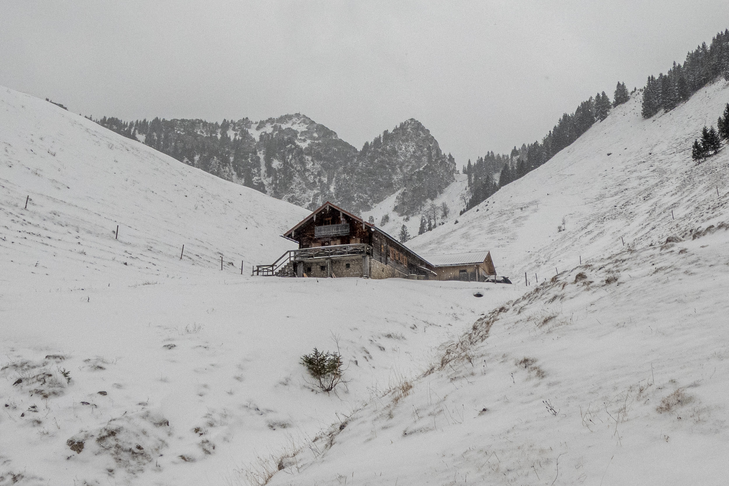 Dementsprechend war der Aufstieg heute problemlos zu Fuß machbar. Zum Teil hatte es unter den paar Zentimetern lockeren Neuschnee von heute Nacht eine etwas harte, rutschige Schneeschicht auf den Wegen, weshalb ich im steilen oberen Teil die Grödeln angelegt habe. Die Drahtseile in der Nordflanke der Hochsalwand waren noch nutzbar. Schneeschuhe wären eher hinderlich gewesen, da man damit ständig auf die Felsen durchgekommen wäre. Lawinengefahr gab es noch keine – selbst die größten Triebschneeansammlungen am Weg waren noch zu wenig. Die Situation wird sich aber jetzt in den nächsten Tagen deutlich ändern. Mit Neuschnee und dem starken Wind wird die steile Querung unter dem Lechnerköpfl sicher heikel werden und ist dann nicht mehr ratsam. Vermutlich werden bald auch Schneeschuhe Sinn machen. Zu hoffen wäre aber, dass es so viel schneit, dass bald auch hier Skitouren möglich sind, zum Beispiel auf die Rampoldplatte.