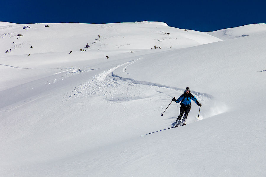 Die kilometerbreiten Skihänge zwischen Hirzer und der Lizumer Hütte bieten mehrere Ziele für tolle Tiefschneeabfahrten. Das beliebteste davon ist neben dem Hirzer zweifellos die Grafennsspitze. Nach dem eher kurzen Anmarsch im Talgrund entlang des Winterwegs zur Lizumer Hütte führt die Route auf etwa 1000 Höhenmeter über breite, hindernislose Hänge. Einziges Manko ist die west-süd-westseitige Ausrichtung, die in schneearmen, windigen Wintern gerne für abgeblasene Passagen oder nach einem sonnigen Tag im Hochwinter gerne für einen Bruchharsch-Deckel sorgt. Dafür können aber im Spätwinter und Frühjahr bald Firnbedingungen herrschen.