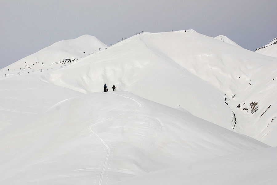 Eine Skitour auf einen Liftberg? Zugegeben, zuerst hört sich das wenig verlockend an. Allerdings sprechen gleich mehrere Faktoren dafür: erstens sind in diesem Skigebiet im April unter der Woche praktisch keine Leute mehr unterwegs (als wir auf den Kudebi gestiegen sind wurden die Lifte für weniger als 10 Personen am Laufen gehalten, die an diesem Tag hier beim Skifahren waren), zweitens tangiert man das Skigebiet nur während der letzten 150 Höhenmeter - davor ist man soweit abseits davon, dass man es kaum mitbekommt - und drittens handelt es sich um eine hervorragende Aussichtstour, die vor allem für den ersten Tourentag im Gebiet zu empfehlen ist, da man sich einen perfekten Überblick über die Tourenmöglichkeiten verschaffen kann.