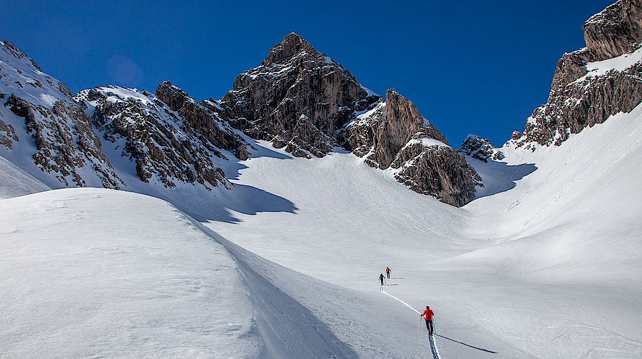 Eine schöne Abfahrt von ca. 300 Hm führt nun hinab ins Lavanter Almtal. Hier müssen nochmal die Felle aufgezogen werden und man steigt nach Westen durch das anfangs flache Kar, zuletzt durch eine steile Ostrinne bis ins Laserztörl (2497 m).