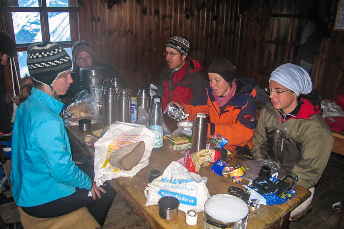 Aufstieg zum Rifugio Mezzalama: Vom Parkplatz am Dorfplatz folgt man zuerst dem Sträßchen noch einige Minuten rechts vom Bach talaufwärts, bis links ein Wanderweg über den Bach führt, mit der Ausschilderung "Rif. Mezzalama". Der anfangs gut ausgebaute Weg führt hinauf zu einem Almkessel - dem Pian di Verra Inferiore. Sollte hier bereits Schnee liegen, zieht man durch Mulden nach rechts über eine Stufe hinauf in den nächsten Almkessel - andernfalls folgt man dem Sommerweg. Hinter der nächsten Alm ist nochmal ein steilerer Südhang zu überwinden, bis man in den wiederum flacheren Boden rechts der ausgeprägten Moräne des Ghiacciao di Verra gelangt. Hier hält sich der Schnee länger und meist kann man hier wählen, ob man rechts über den Schnee aufsteigt, oder links über den schneefreien Moränenrücken, auf dem sich auf einer Höhe von 3004 m in herrlicher Lage die Mezzalama-Hütte befindet. Der Winterraum der Hütte ist offen, Decken sind genügend vorhanden, allerdings gibt es keine Kochmöglichkeit.