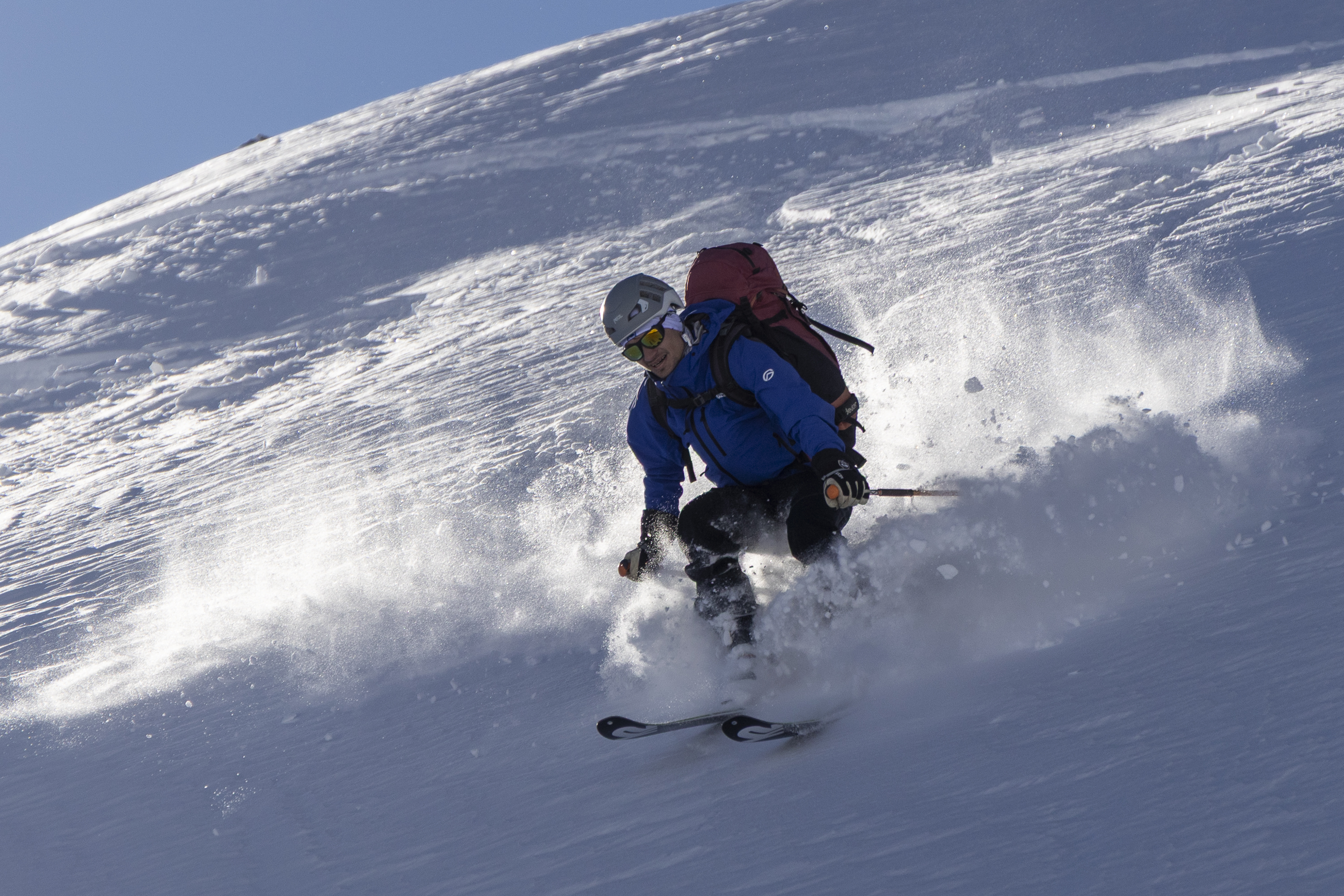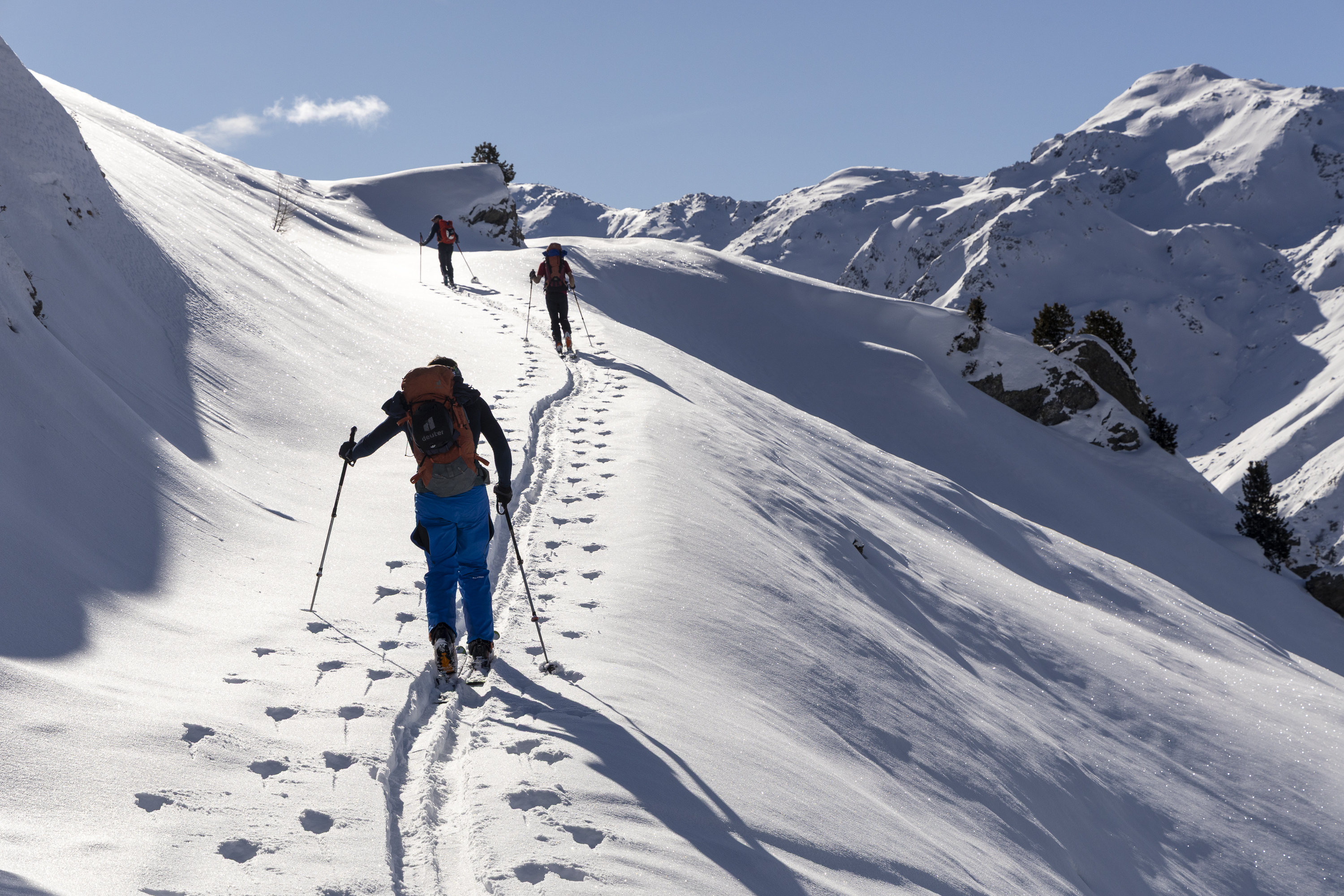 Dieser Tag führt fast durchgehend durch perfektes Skigelände und es sind dabei unzählige Varianten denkbar. Von der Weidener Hütte muss man zuerst auf den Kamm zwischen Hohem Kopf und Halslspitze aufsteigen und jenseits ins Nurpenstal abfahren – die lawinensicherste Route lässt sich meist über den Hohen Kopf finden. Ebenfalls recht lawinensicher ist der weitere Aufstieg ins Pfundsjoch möglich und von dort mit mehreren kurzen Abfahrten und Aufstiegen der Weiterweg über das Sidanjoch zur Rastkogelhütte. Auch für den Umweg über den Rosskopf lässt sich meistens eine sichere Route finden.