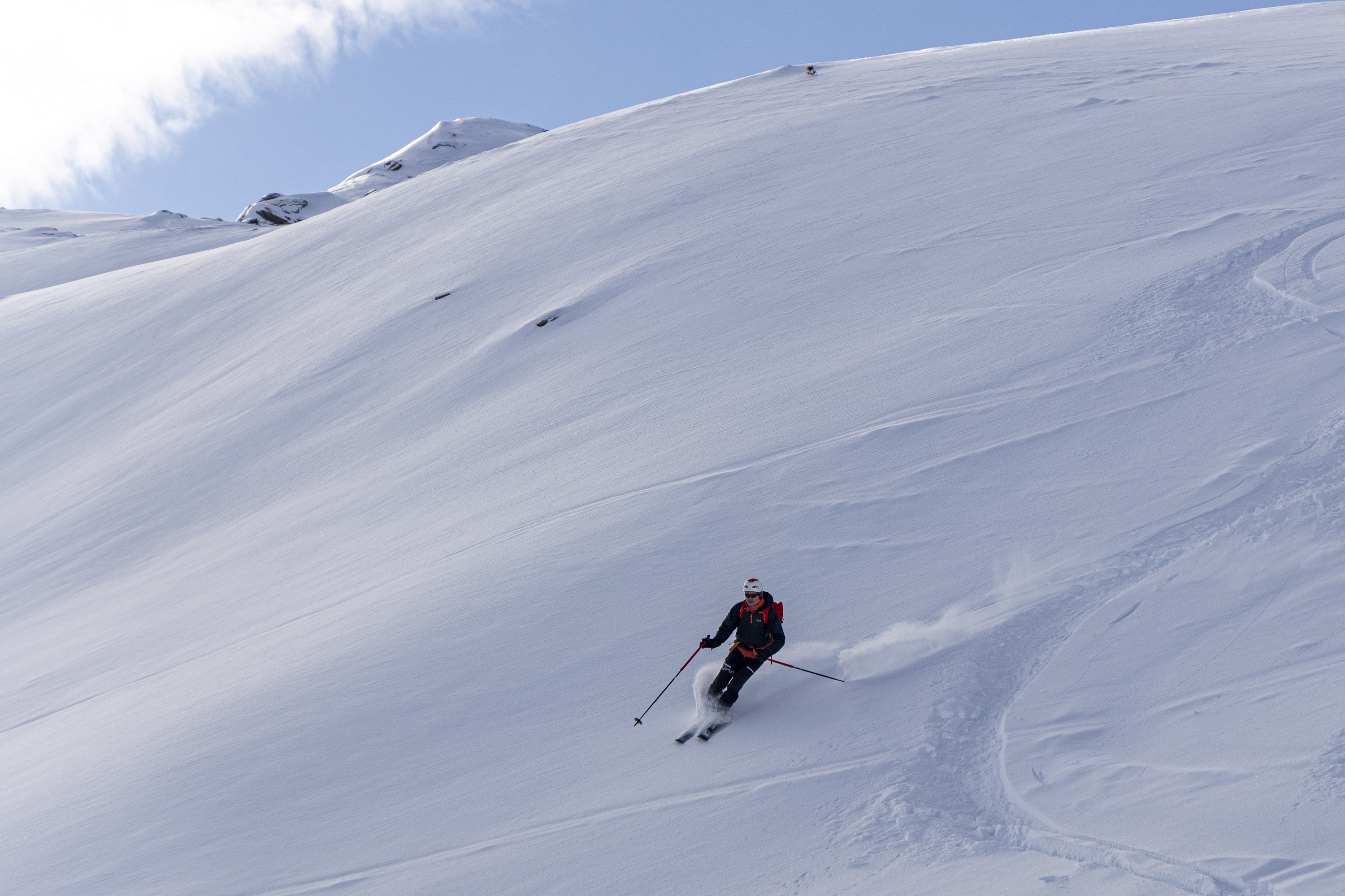 Stabile Bedingungen benötigt die Besteigung des Rastkogels. Bei gutem Pulverschnee ist die Route über Halslspitze – Haglhütte – Rastkogel – Sidanalm oft das skifahrerische Highlight der gesamten Durchquerung.