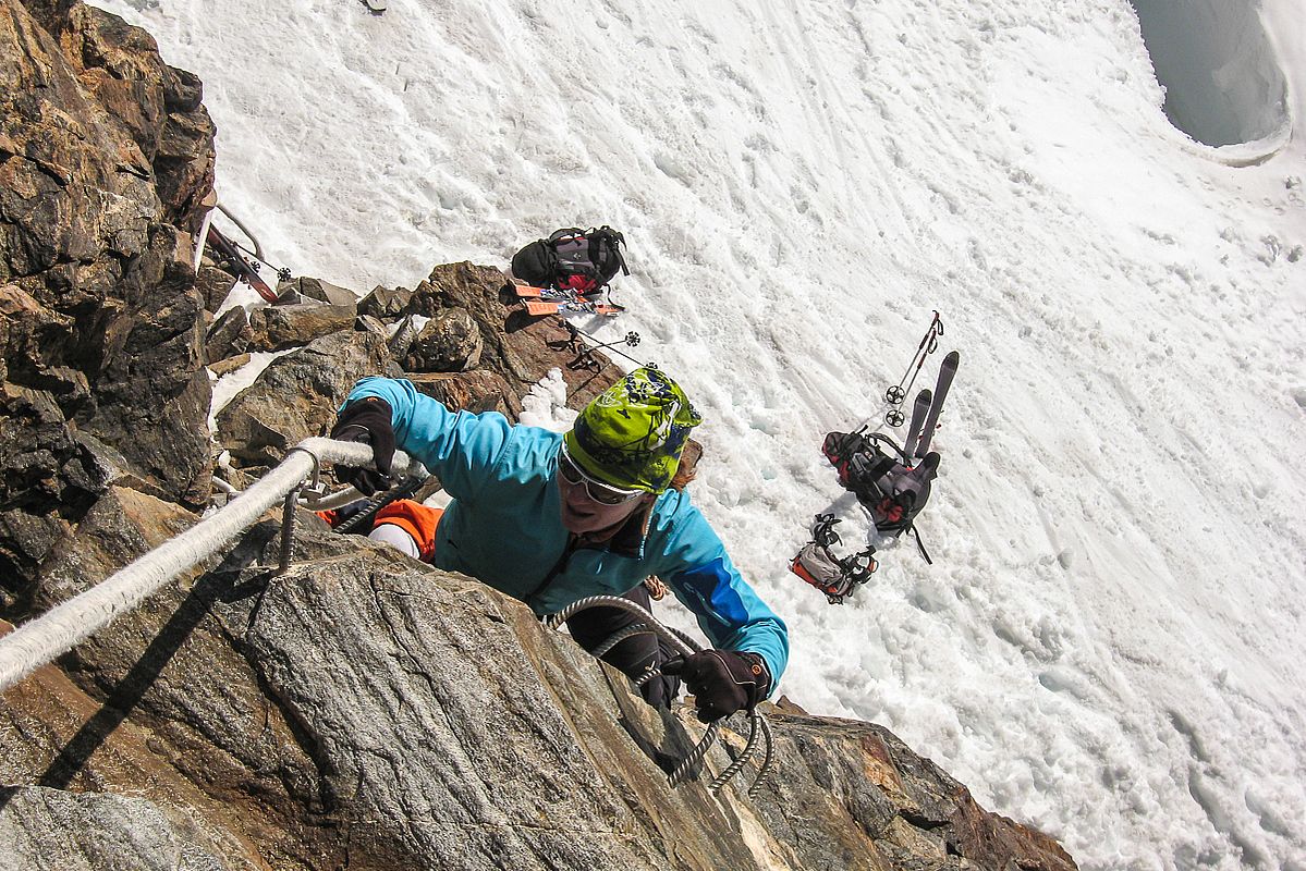 Wer unbedingt die Punta Giordani "mitnehmen" möchte, der kann seine Ski hier lassen und über den Verbindungsgrat nach Osten hinabklettern (Stellen II) und die wenigen Meter zu diesem Gipfelchen aufsteigen. Ansonsten fährt man gleich wieder die Nordflanke ab bis in den nördlich davon gelegenen Sattel, wo erneut die Felle aufgezogen werden. Ein kurzer Hang bringt uns zu dem Fuß der Felsinsel des Balmenhorn mit seiner Biwakschachtel und der riesigen Jesus-Figur. Über einen kurzen Klettersteig steigen wir die 30 Meter hinauf zum Gipfel.